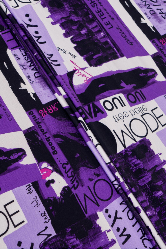 Viskozes elastīgs trikotāžas audums ar "avīzes" motīvu melnā un violetā krāsā ar baltiem elementiem.