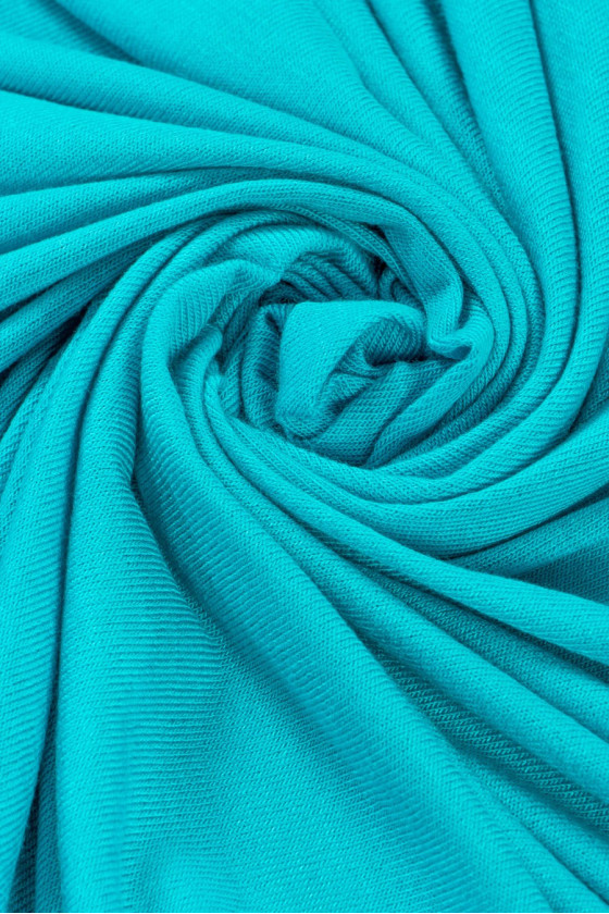 Plāns tirkīza trikotāžas audums blūzēm. Trikotāžas audums ir nedaudz elastīgs, plūstošs.