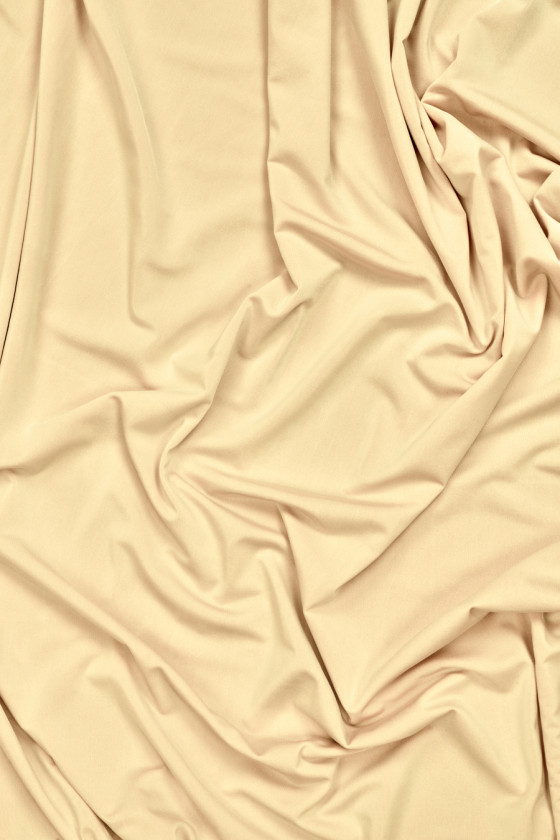 Itāļu elastīgs trikotāžas audums gaiši bēšā krāsā. Materiāls ar blīvu austu un gludu struktūru, plāns, bet necaurspīdīgs, ļoti elastīgs - ideāli piemērots cilvēkiem, kuriem patīk ķermenim pieguļošs apģērbs un mūžīgas krāsas. Tas ir lieliski piemērots blūzes, kleitas šūšanai un arī apakšveļas šūšanai, jo tas ir ērts un ātri žūstošs.