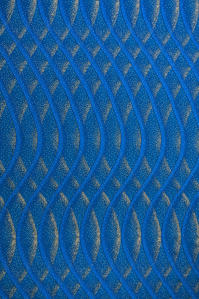 Itāļu žakarda kostīma audums zilā krāsā ar zeltu. Audums ir austs zilu viļņu rakstā, kas dekorēts ar ziliem un zelta punktiem. Materiālam ir izliekta struktūra, tā ir mīksta, plāna, bet necaurspīdīga. Skaists piedāvājums kleitas, svārku un žaketes šūšanai īpašiem gadījumiem.