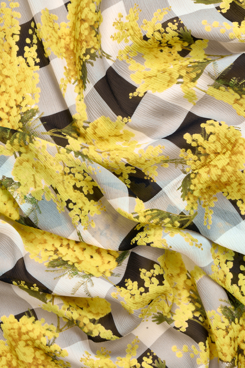 Itāļu 100% zīda krokains šifons ar dzeltenu mazu ziedu motīvu, kas sakārtots pušķa formā uz melna, pelēka un krēmkrāsas rūtaina fona. Audums ir viegls, caurspīdīgs, gaisīgs, elastīgs - tas darbojas uz pavedieniem. Ideāls piedāvājums gaisīgas kleitas, blūzes vai šalles šūšanai.