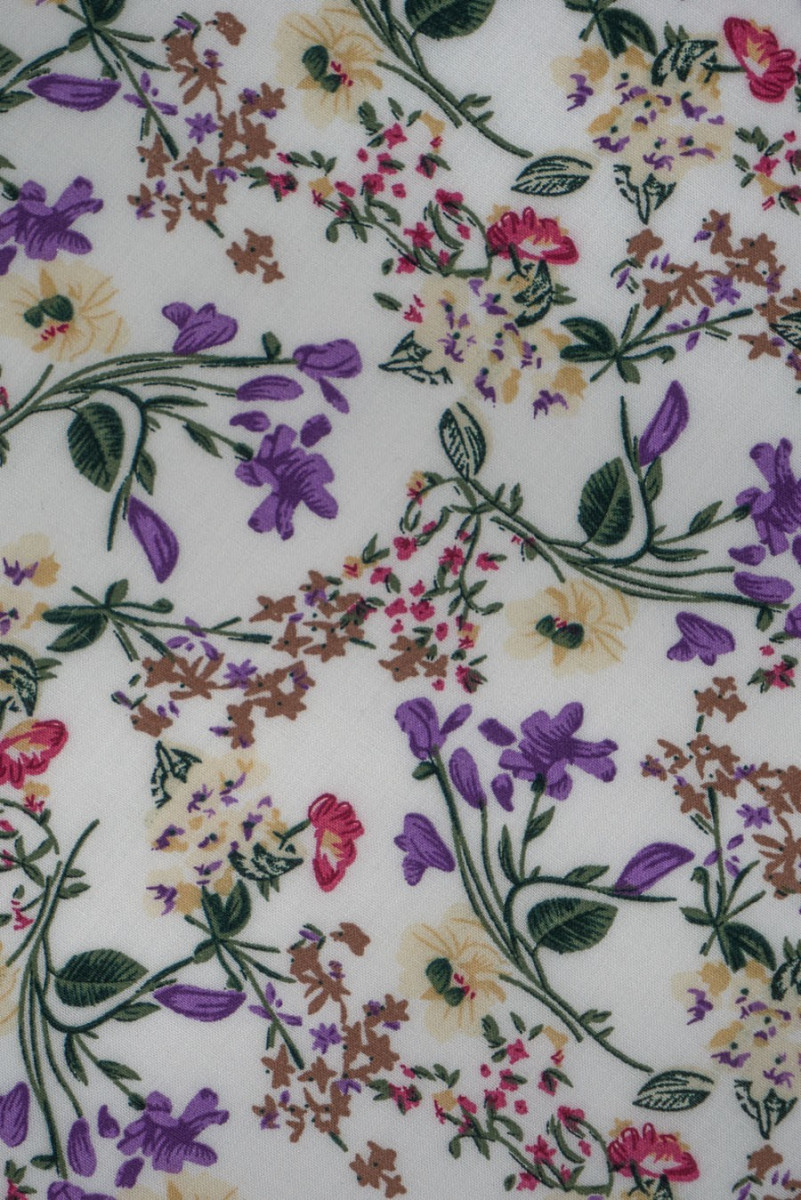 Itāļu audums 100% viskoze ar maziem, krāsainiem ziediem uz ecru fona. Mīksts, plūstošs, plāns, bet necaurspīdīgs audums - lieliski piemērots blūzes, kleitas, svārku šūšanai.