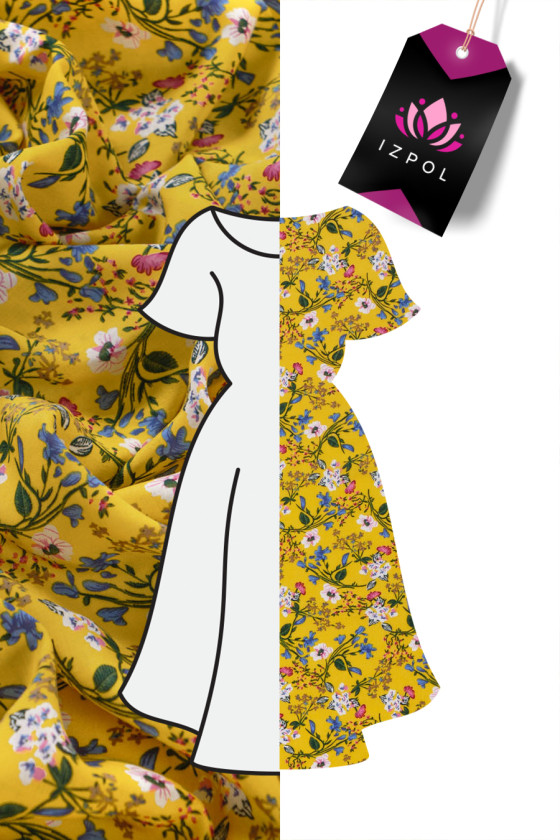 Itāļu audums 100% viskoze ar mazu ziedu (pļavu) motīvu uz dzeltena fona. Neelastīgs, matēts, smags audums - ideāli piemērots vasaras kleitas, blūzes vai svārku šūšanai. Sastāvs: