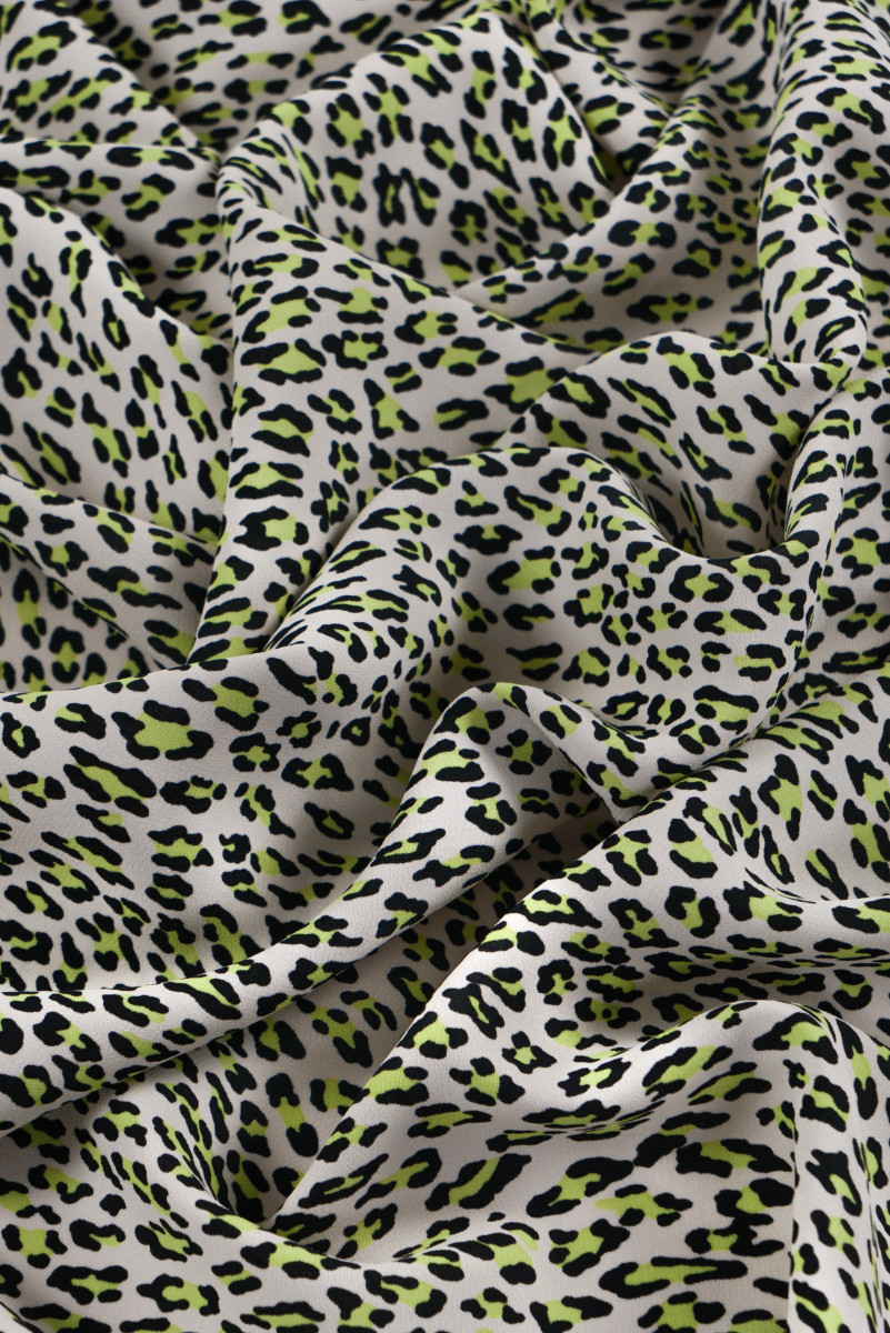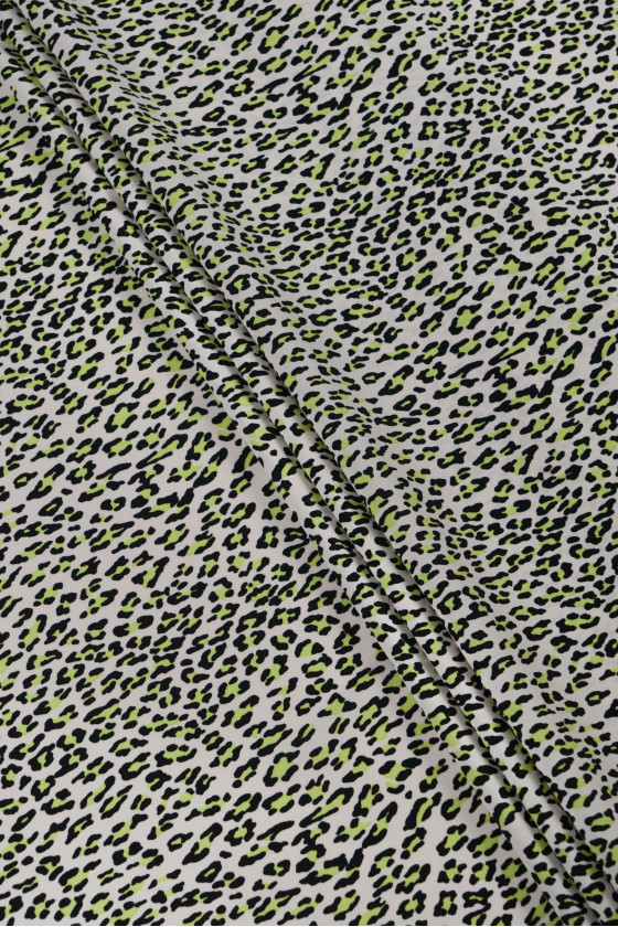 Itāļu 100% viskozes audums ar zaļu un melnu leoparda apdrukas motīvu uz ecru fona. Audums ir smags, plūstošs, ar austu, kas atgādina georgette. Ideāli piemērots kleitas, blūzes, svārku šūšanai.
