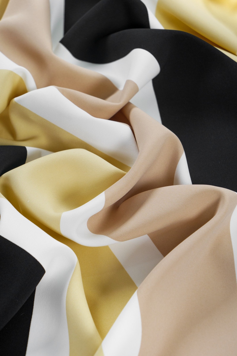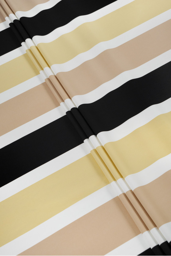 Itāļu kadi viskozes audums ar 3,5 cm un 10 cm platām svītrām šādās krāsās: melns, écru, bēšs un dzeltenīgi bēšs. Cadi audums ir necaurspīdīgs, mīksts, plūstošs (smags).