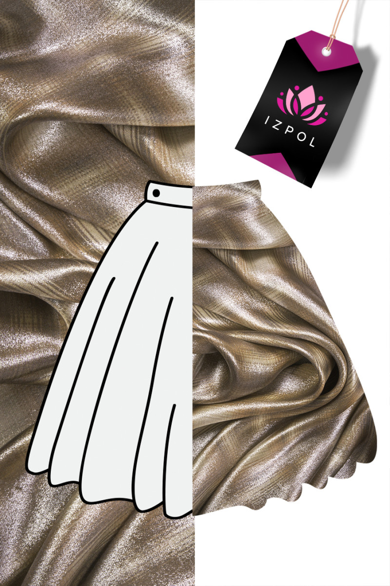 Itāļu viskozes audums ar izplūdušu čekas motīvu bēšā un brūnā krāsā, dekorēts ar zelta lurex diegu, kas rada mirdzuma efektu. Viskoze ir audums, kas iegūts no celulozes, ļoti elpojošs un mīksts, tas ir ādai draudzīgs (nav alerģisks) un lieliski absorbē mitrumu. Neelastīgs, nedaudz caurspīdīgs audums - ideāli piemērots vasaras kleitas, blūzes vai svārku šūšanai.