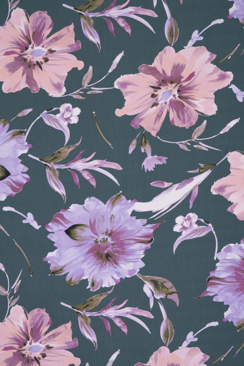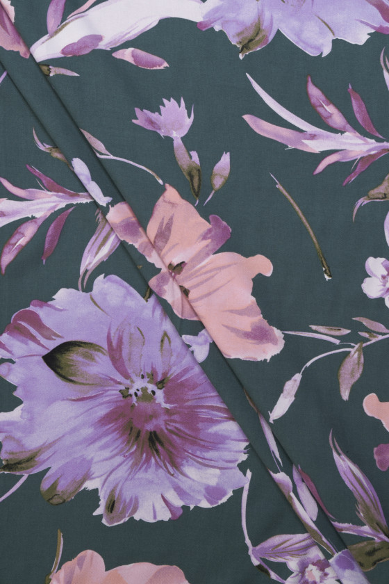 Itāļu 100% viskozes audums tumšā, klusinātā zaļā krāsā ar lielu ziedu motīvu (aptuveni 25 cm) viršu un laša krāsā, ziediem ir purpursarkans un zaļš pildījums, šī apstrāde padarīja rakstu plakanu un izteiksmīgāku. Ziedu motīvi ieskauj mazākas lapas un zarus, kas padarīja to blīvu. Audumam ir smalks pinuma austs, tas ir neelastīgs, ļoti mīksts un patīkams pieskarties. Skaists piedāvājums cilvēkiem, kuriem patīk ziedu raksti smalkās, klusinātās krāsās.