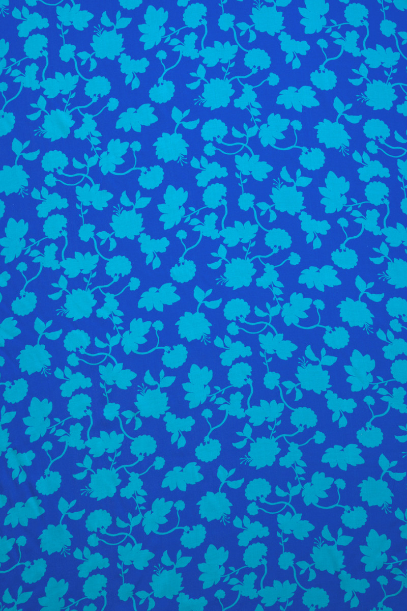 Itāļu 100% viskozes audums rudzupuķu zilā krāsā ar blīvu tirkīza ziedu motīvu. Apdruka ir ļoti raksturīga un attēlo tikai ziedu formas. Audums nav elastīgs, mīksts un necaurspīdīgs, ļoti patīkams pieskarties. Šī suga ir ideāli piemērota karstām vasaras dienām.