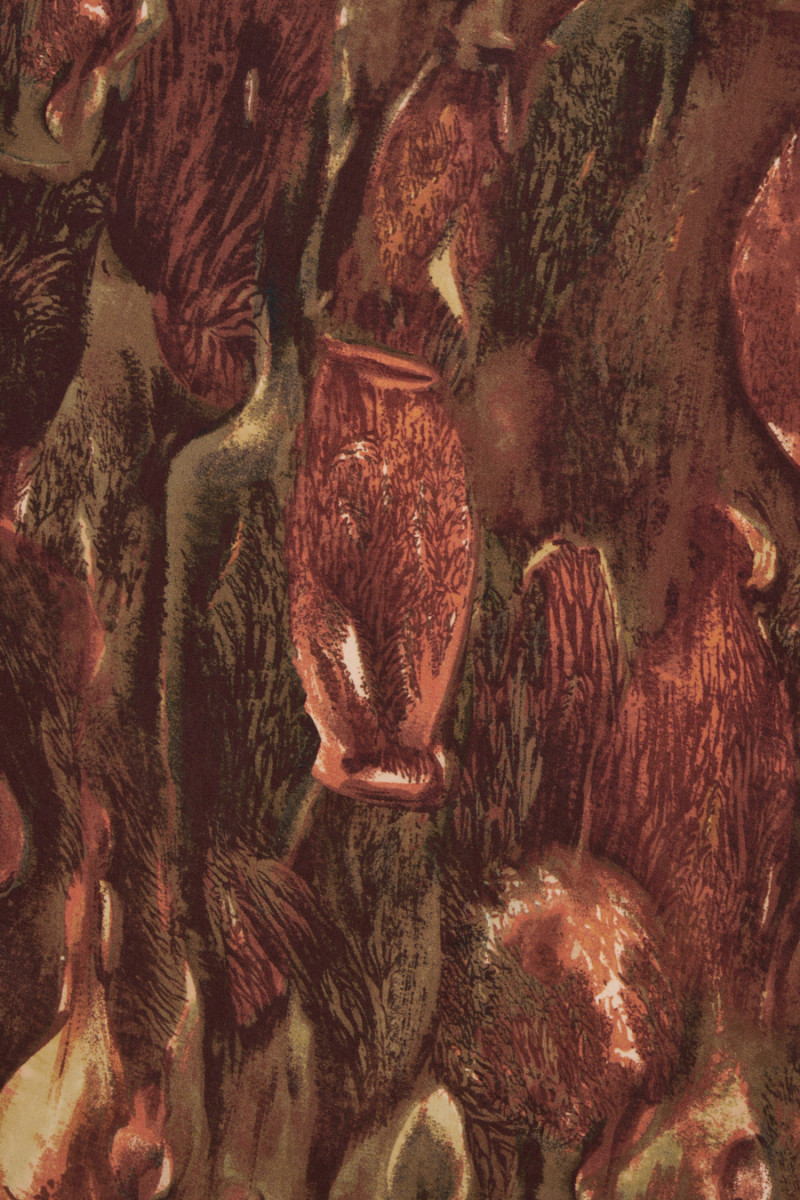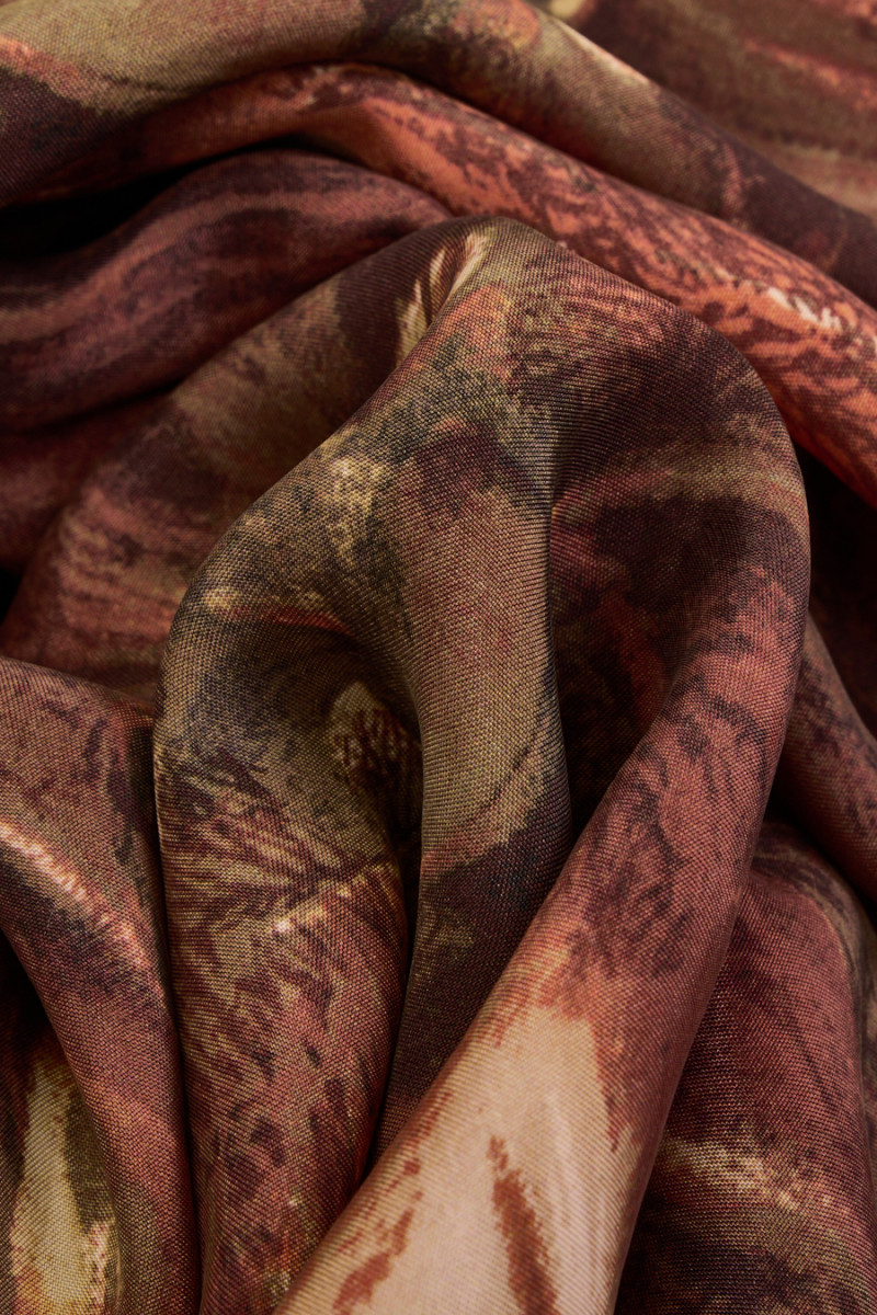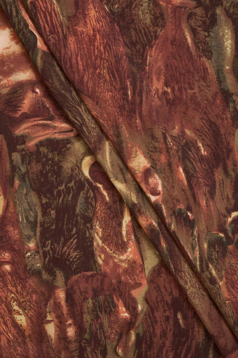 Itāļu 100% viskozes audums ar neskaidras veģetācijas motīvu brūnā un olīvu zaļā krāsā. Audums ir plūstošs, viegls, ļoti patīkams pieskarties, necaurspīdīgs un maigi darbojas uz pavedieniem. Tas ir lieliski piemērots blūzes, svārku un kleitas šūšanai.