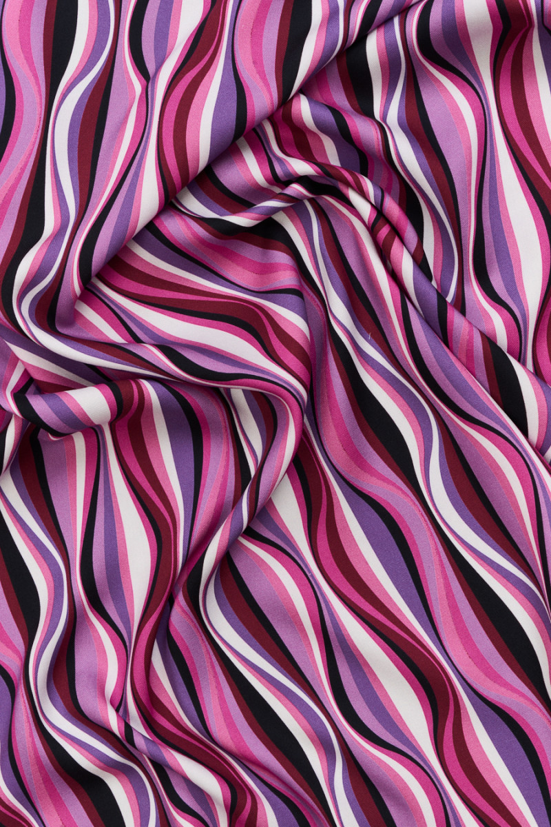 Itāļu audums 100% viskoze ar viļņu rakstu rozā, violetā, krēmkrāsā un melnā krāsā. Audums ir mīksts, matēts, plūstošs, necaurspīdīgs un ļoti patīkams pieskarties. Krāsains piedāvājums, no kura jūs varat šūt kleitu, svārkus, blūzi vai šortus.