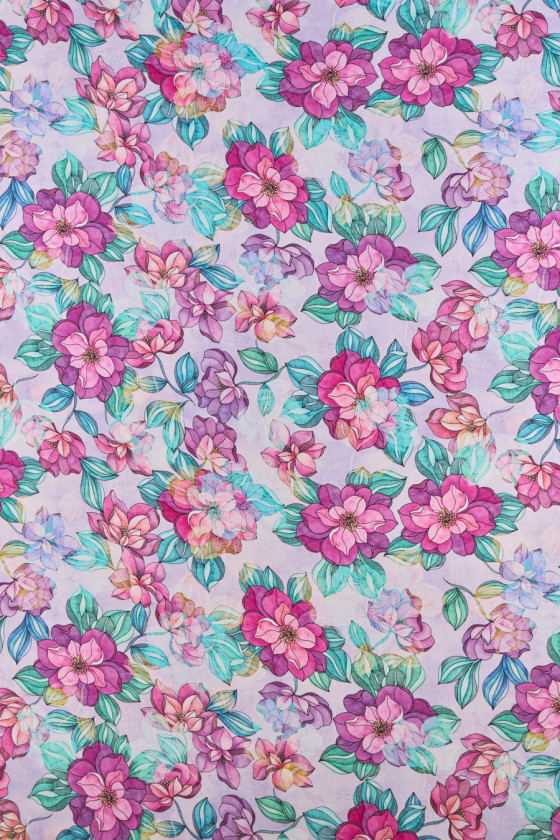 Itāļu audums 100% viskoze ar lieliem, rozā ziediem un gaiši zaļām lapām uz ceriņu fona. Audums ir satīns, mīksts, plūstošs, viegls un ļoti patīkams pieskarties. Ideāls piedāvājums unikāliem tērpiem, piemēram, kleitām, svārkiem, blūzēm un krekliem.