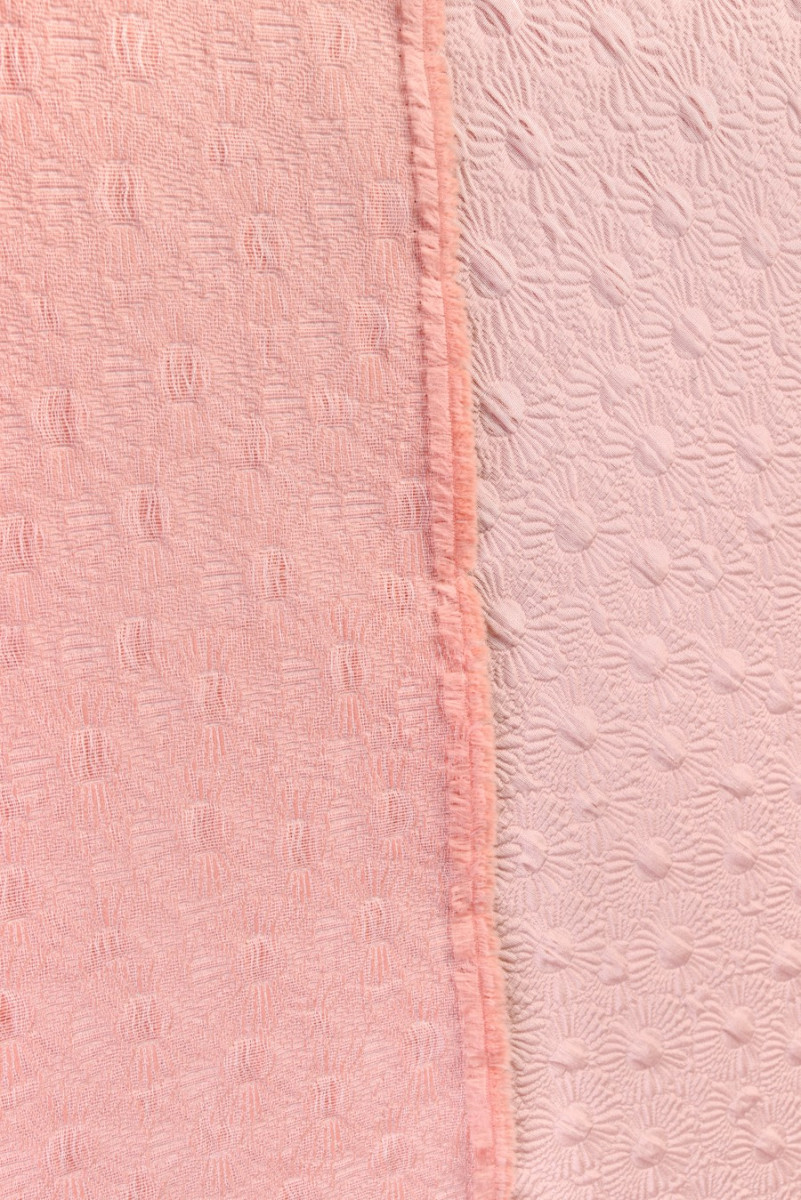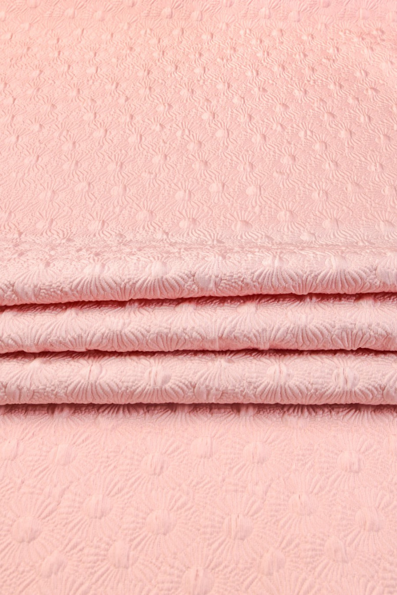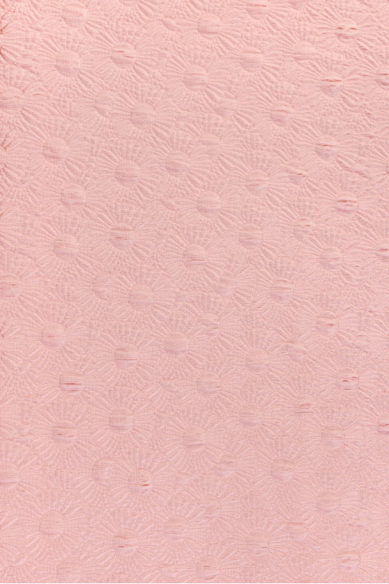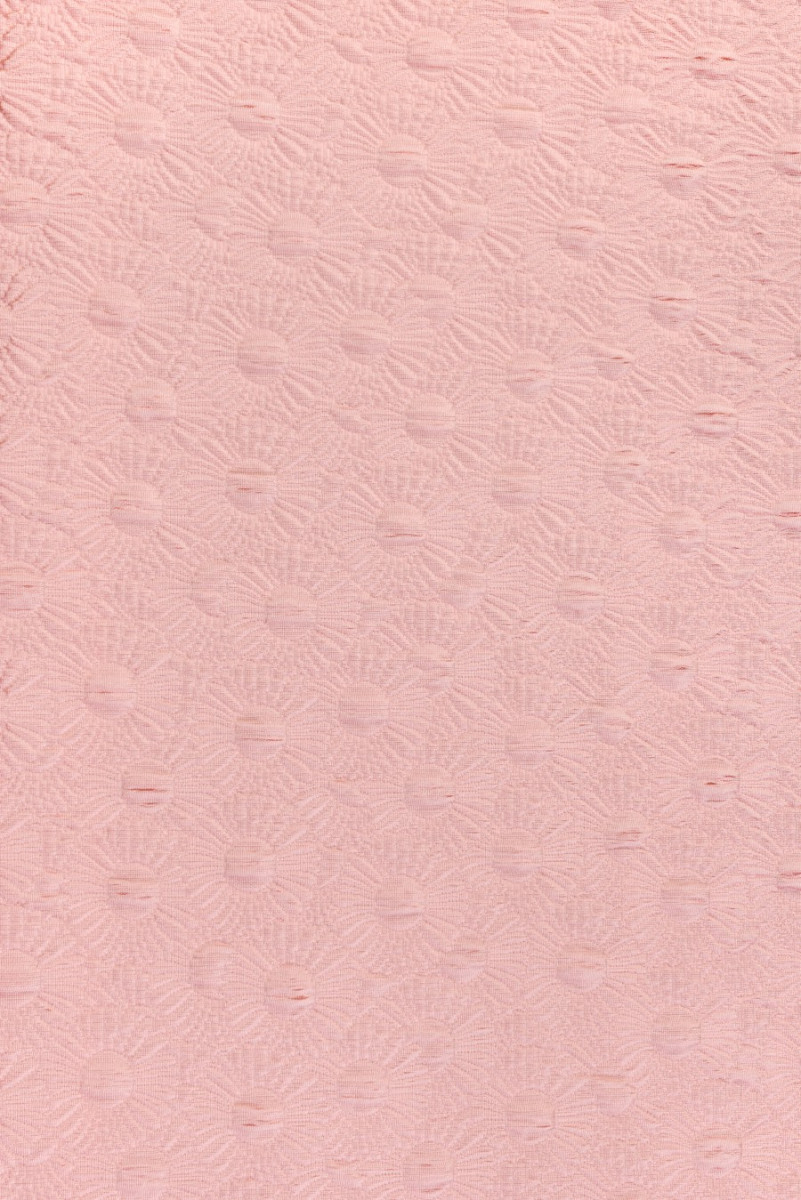 Itāļu žakarda kostīmu audums gaiši rozā krāsā. Ļoti oriģināls, reljefs modelis ar pārklājošiem margrietiņu ziediem apmēram 4 cm lielumā. Viss ir izgatavots vienā krāsā, kas padara modeli ļoti smalku un delikātu. Audums ir vidēja biezuma, matēts un nedaudz stīvs. Tas ir ideāli piemērots kostīma, kleitas, mēteļa vai dekoratīviem nolūkiem.