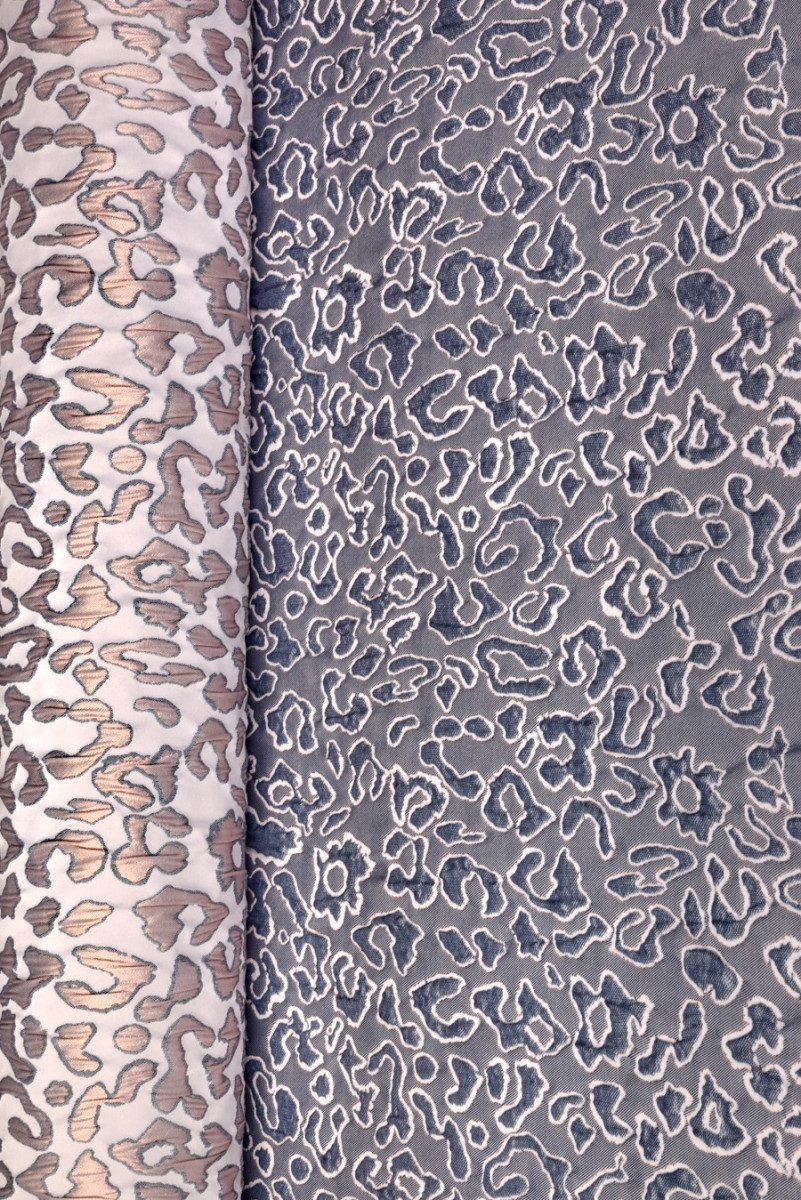 Itāļu žakarda kostīma audums krēmbaltā krāsā. Materiālam ir ļoti interesants modelis, kas atgādina leoparda apdruku ar izmēru apmēram 4 cm. Dzīvnieku motīvs ir izgatavots no spīdīga vara krāsas pavediena, un tam papildus ir tumši zila robeža. Audums ir ļoti efektīvs, tam ir nedaudz gofrēta struktūra, kas dod tai "pūkainu". Tā neparastā kaļamība un stīvums padara to ideāli piemērotu apģērbu šūšanai ar konstrukciju.