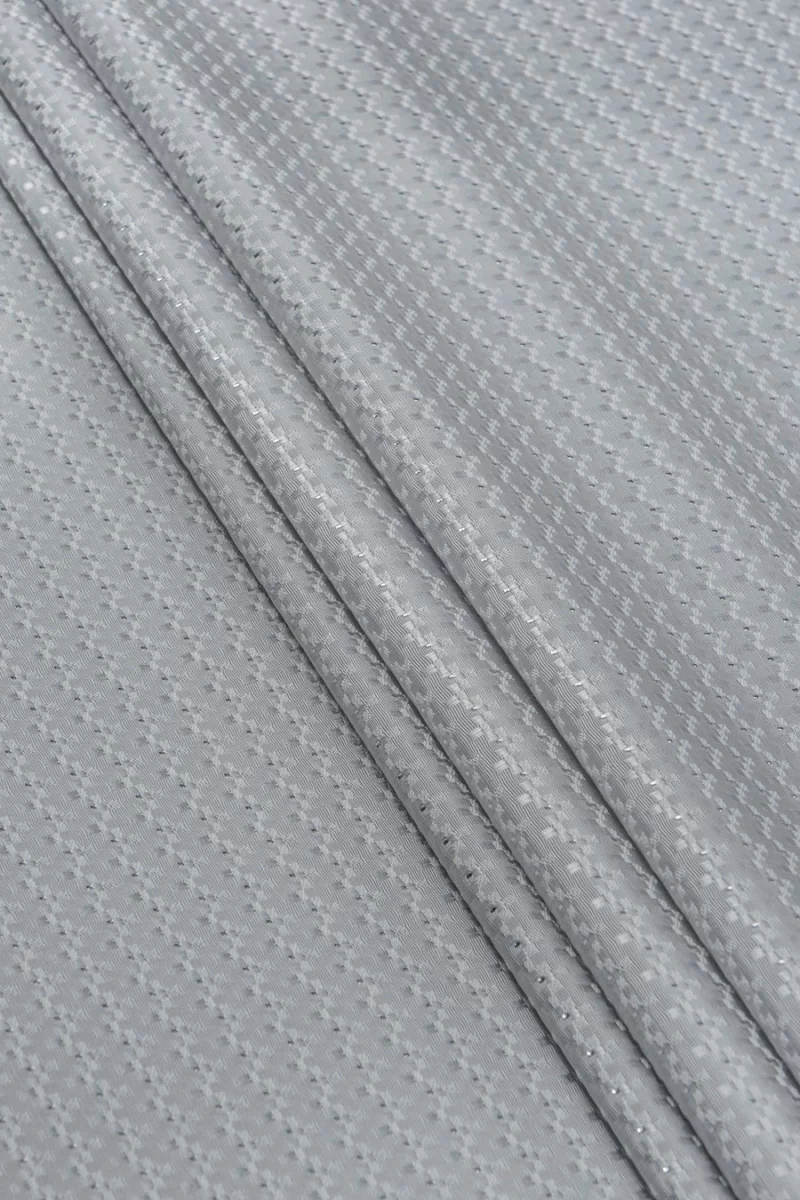 Itāļu žakarda kostīma audums sudrabaini pelēkā krāsā. Ļoti interesants, regulārs nelielas pārbaudes modelis rada horizontālas svītras 1 cm platumā. Turklāt tas ir dekorēts ar kvadrātiem, kas izgatavoti no spīdīga sudraba pavediena. Audums ir mīksts un neelastīgs un nedaudz stīvs. Tas ir lieliski piemērots kostīma, kleitas vai iespaidīgas vestes ar uzvalku šūšanai.