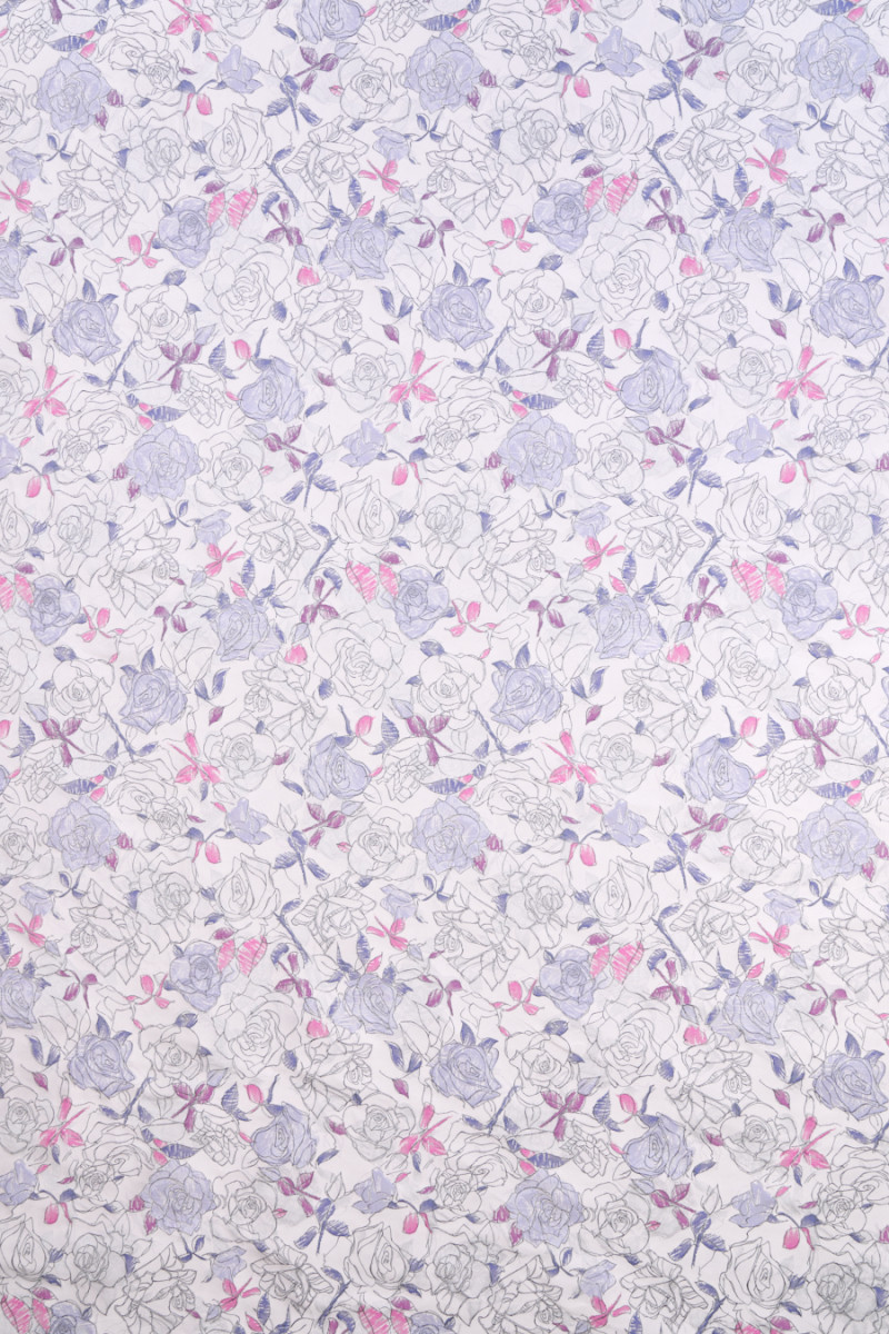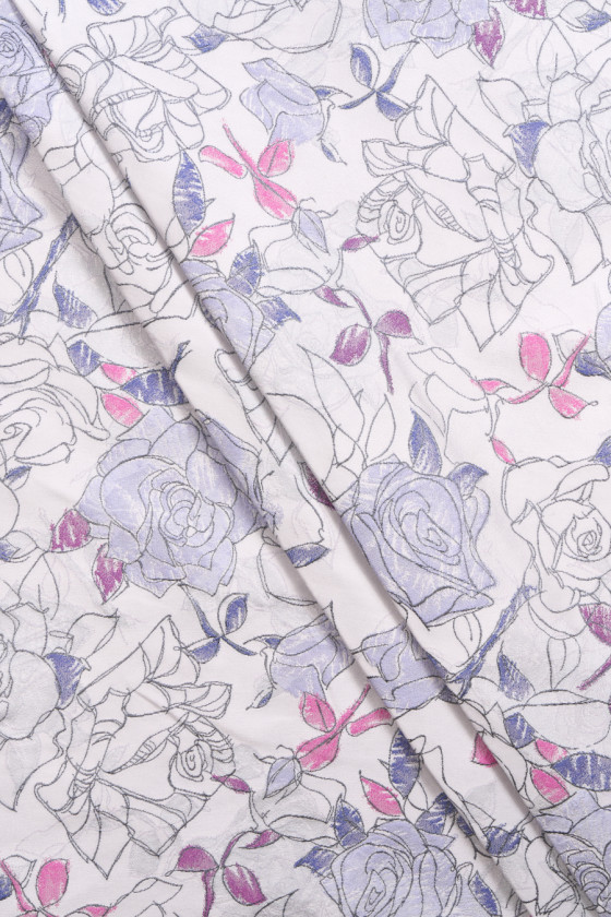 Itāļu žakarda kostīmu audums gaiši pelēkā krāsā. Materiālam ir ļoti oriģināls skicētu rožu ziedu raksts, skice ir izgatavota no pelēka spīdīga pavediena, kas tam piešķir eleganci. Dažiem ziediem ir purpura pildījums, turklāt lapas ir rozā, purpura un tumši zilā krāsā. Auduma kreisā puse ir arī ļoti efektīva un to var izmantot. Materiālam ir saspringts austs, tas ir neelastīgs un stingrs. Lielisks piedāvājums kostīma, kleitas, svārku šūšanai vai dekoratīviem nolūkiem.