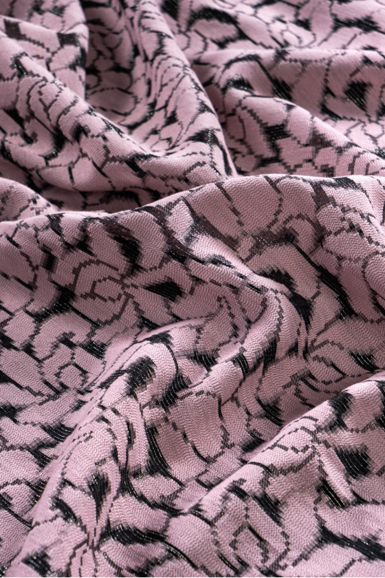 Itāļu žakarda kostīma audums, kas austs devore tehnikā. Tā ir gludas, caurspīdīgas organzas kombinācija, kas izgatavota no dabīga zīda melnā krāsā ar necaurspīdīgu ziedu motīvu netīri rozā krāsā. Turklāt visam audumam ir ieausts sudrabs, spīdīgs pavediens. Materiāls ir plāns un nedaudz stīvs, un tajā pašā laikā tas nedaudz spīd. Ļoti oriģināls piedāvājums kleitas vai svārku šūšanai.