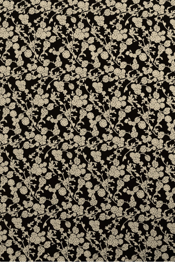 Viskozes žakards melnā krāsā ar écru ziedu apdruku. Vidēji biezs audums, cieši austs, nedaudz stīvs.
