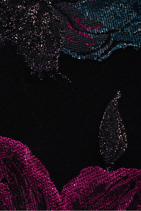Itāļu žakarda kostīmu audums ar blīvu ziedu motīvu. Auduma fons ir izgatavots melnā krāsā ar blīvu pelēku rakstu ar fuksijas un tirkīza ziediem, viss ir dekorēts ar sudraba, spīdīgu pavedienu. Audums ir neelastīgs un nedaudz stīvs, lieliski piemērots eleganta uzvalka, kleitas vai kostīma šūšanai.