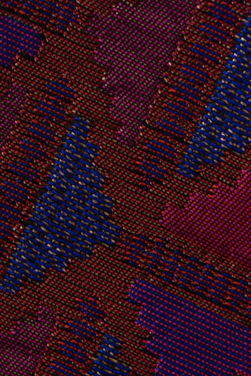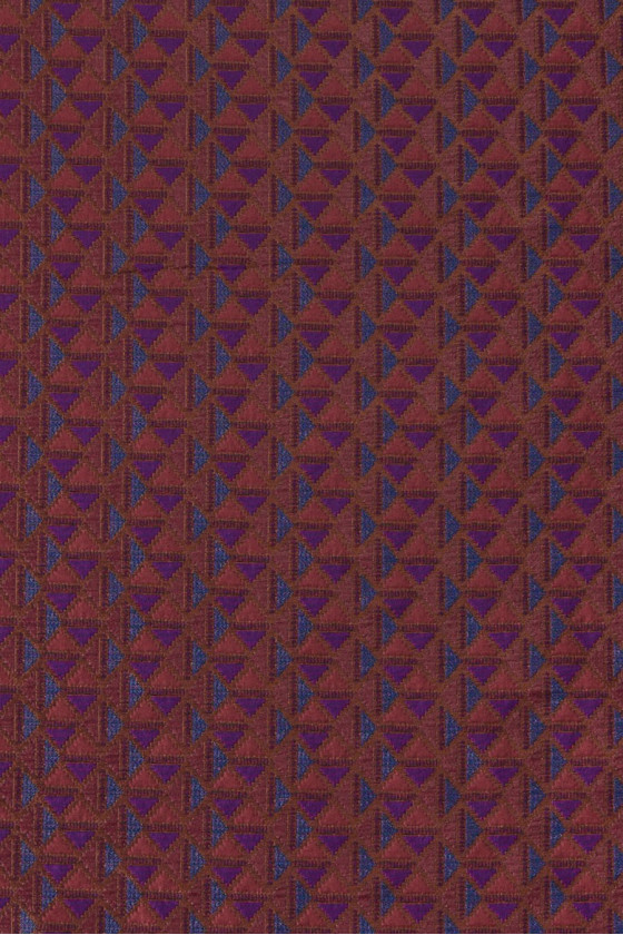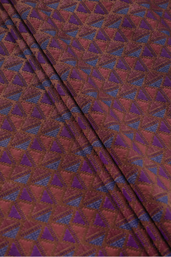 Itāļu žakarda kostīmu audums ar biezāku struktūru. Auduma fons ir vara krāsā ar nelielu, blīvu ģeometrisku motīvu šādās krāsās: violeta, zila, sarkana un rozā. Audums ir biezāks ar kompaktu, gludu austu, neelastīgu. Tas ir lieliski piemērots mēteļa, jakas, biezākas jakas šūšanai vai kā dekoratīvs audums, piemēram, spilveniem.