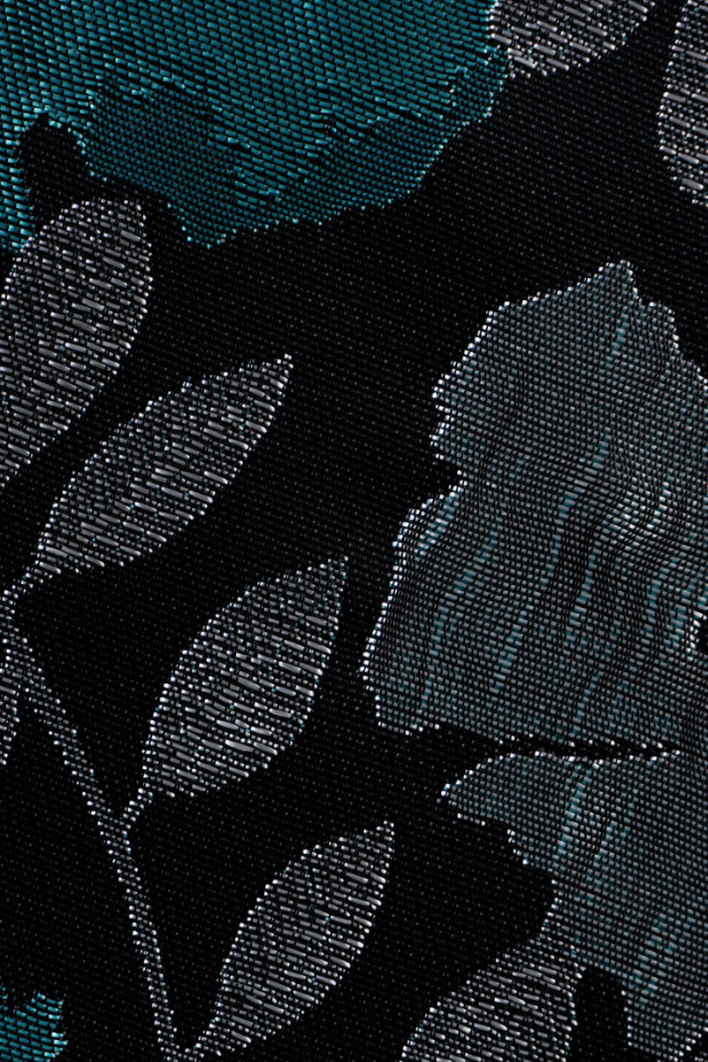 Itāļu žakarda kostīmu audums ar blīvu ziedu motīvu. Auduma fons ir austs no divām pavedienu krāsām: melns un pelēks pavediens maigi pielīp no apakšas, pateicoties kam tam ir divu toņu efekts un mirgo atkarībā no gaismas krišanas leņķa. Ziedu raksts ir austs no spīdīgiem pavedieniem: sudraba un tirkīza, tas ir ļoti blīvs un ziedi ir apmēram 10 cm lieli. Audums nav elastīgs, mīksts - ideāli piemērots kleitas, svārku šūšanai vai dekoratīviem nolūkiem.