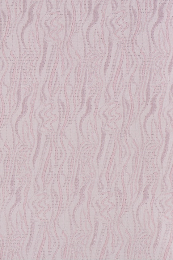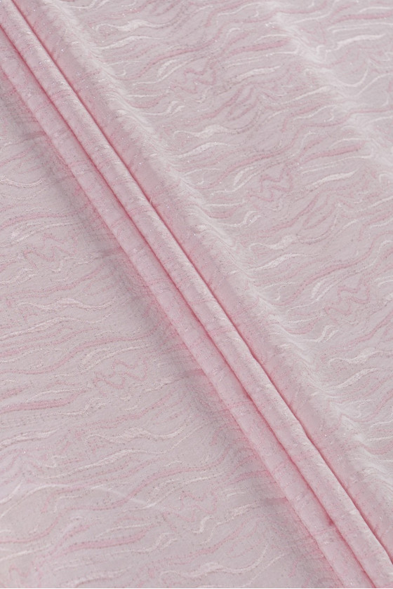 Itāļu žakarda kostīmu audums ar motīvu, kas atgādina viļņus. Auduma fons ir gaiši rozā, savukārt raksts ir izgatavots no gaišāka toņa pavediena nekā fons un tumšāks. Turklāt viss ir dekorēts ar šuvēm, kas izgatavotas no spīdīga sudraba pavediena. Tas padara audumu elegantāku un smalki spīdīgu. Audums ir diezgan plāns, neelastīgs, nedaudz stīvs - lieliski piemērots kleitas, svārku, kostīma šūšanai ģimenes svinībām.