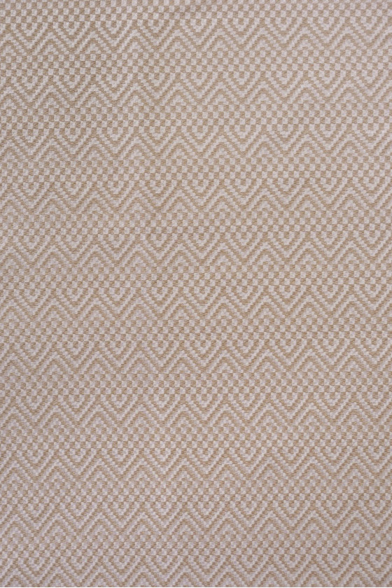 Itāļu žakarda kostīmu audums tranšejas mēteļiem. Ļoti interesants zigzagu motīvs krēmkrāsā un smilškrāsā, kas rada horizontālas svītras. Materiālam ir gluds, nedaudz spīdīgs pinums. Audums ir neelastīgs, nedaudz stīvs ar nelielu spīdumu (biezums un stīvums atgādina taftu).