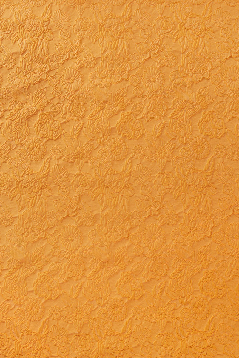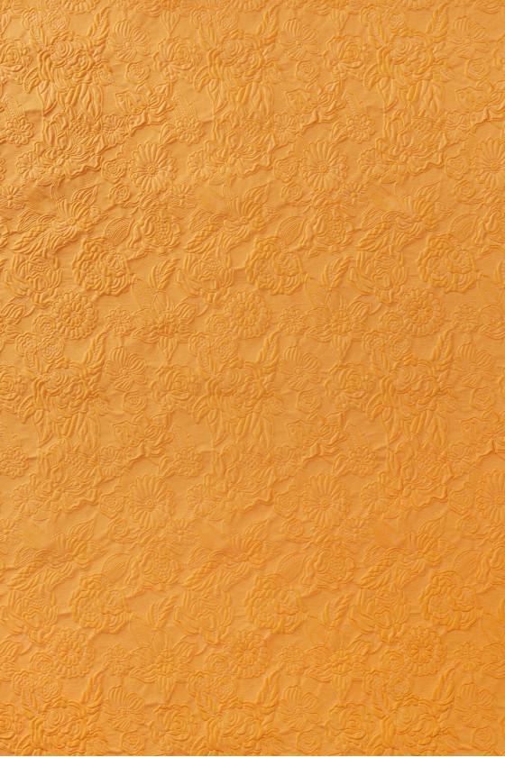 Itāļu žakarda kostīmu audums ar blīvu saspiestu ziedu motīvu. Viss tiek turēts skaistā oranžā krāsā. Audums ir neelastīgs, stīvs, ļoti efektīvs. Tas ir lieliski piemērots pavasara mēteļa, krāšņa uzvalka vai kleitas šūšanai.