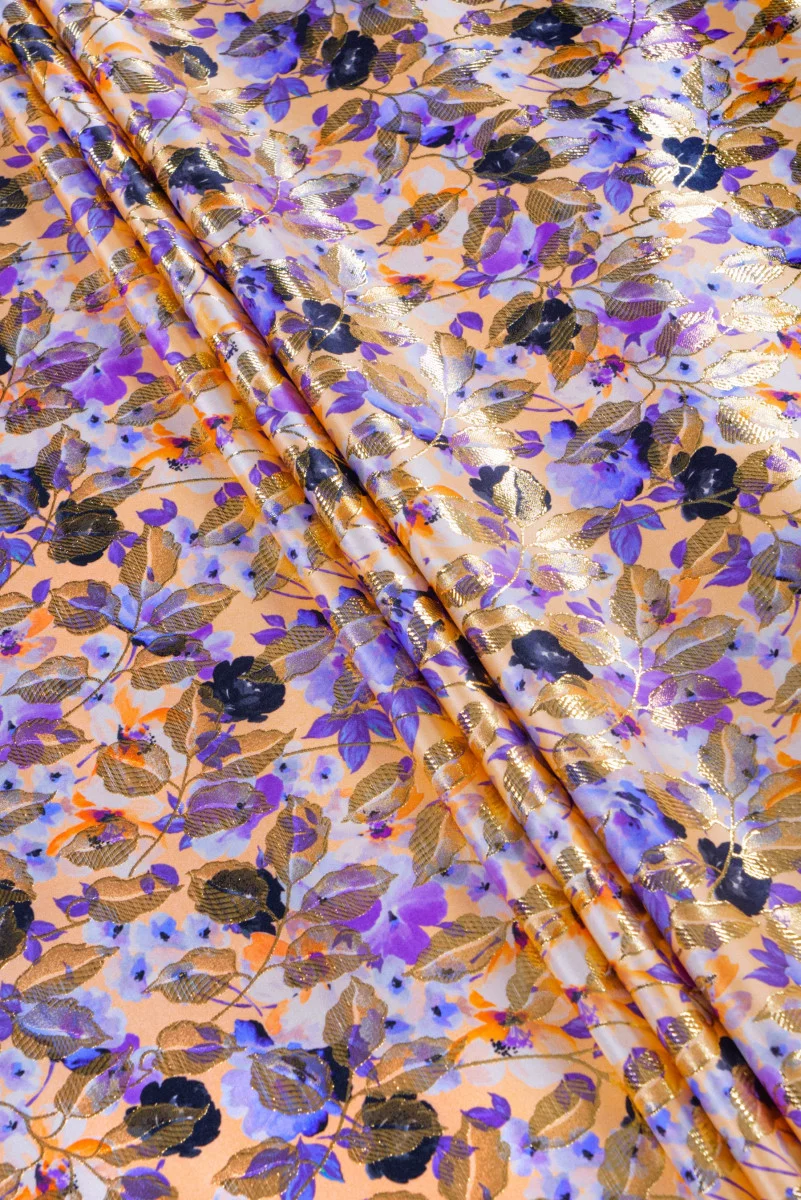 Itāļu žakarda kostīmu audums ar gludu, satīna austu. Auduma fons ir izgatavots aprikozē ar blīvu ziedu rakstu dažādos purpura toņos no viršiem līdz tumšai, dziļai krāsai. Turklāt modelis ir dekorēts ar zelta lapām, kas izgatavotas no spīdīga pavediena. Audums ir neelastīgs, stīvs, ļoti efektīvs. Ideāli piemērots kleitas, kostīma, svārku, plānas mēteļa šūšanai.