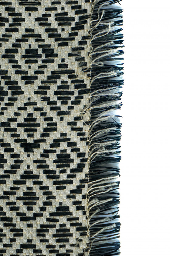 Itāļu žakarda kostīma audums écru ar melnu rafiju. Audums ar mazu dimantu motīvu (3,5 cm). Audums ir biezāks, stīvs, neelastīgs ar raksturīgu spīdumu.