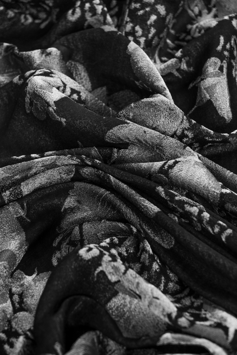 Itāļu žakarda audums melnā krāsā ar pelēku ziedu motīvu - dabīgā zīda un poliestera maisījums. Plāns, nedaudz caurspīdīgs, mīksts, neelastīgs audums ar maigu spīdumu, kas raksturīgs zīda audumiem - to var šūt no abām pusēm. Ideāli piemērots kleitas, blūzes, svārku šūšanai vai dekoratīviem nolūkiem.