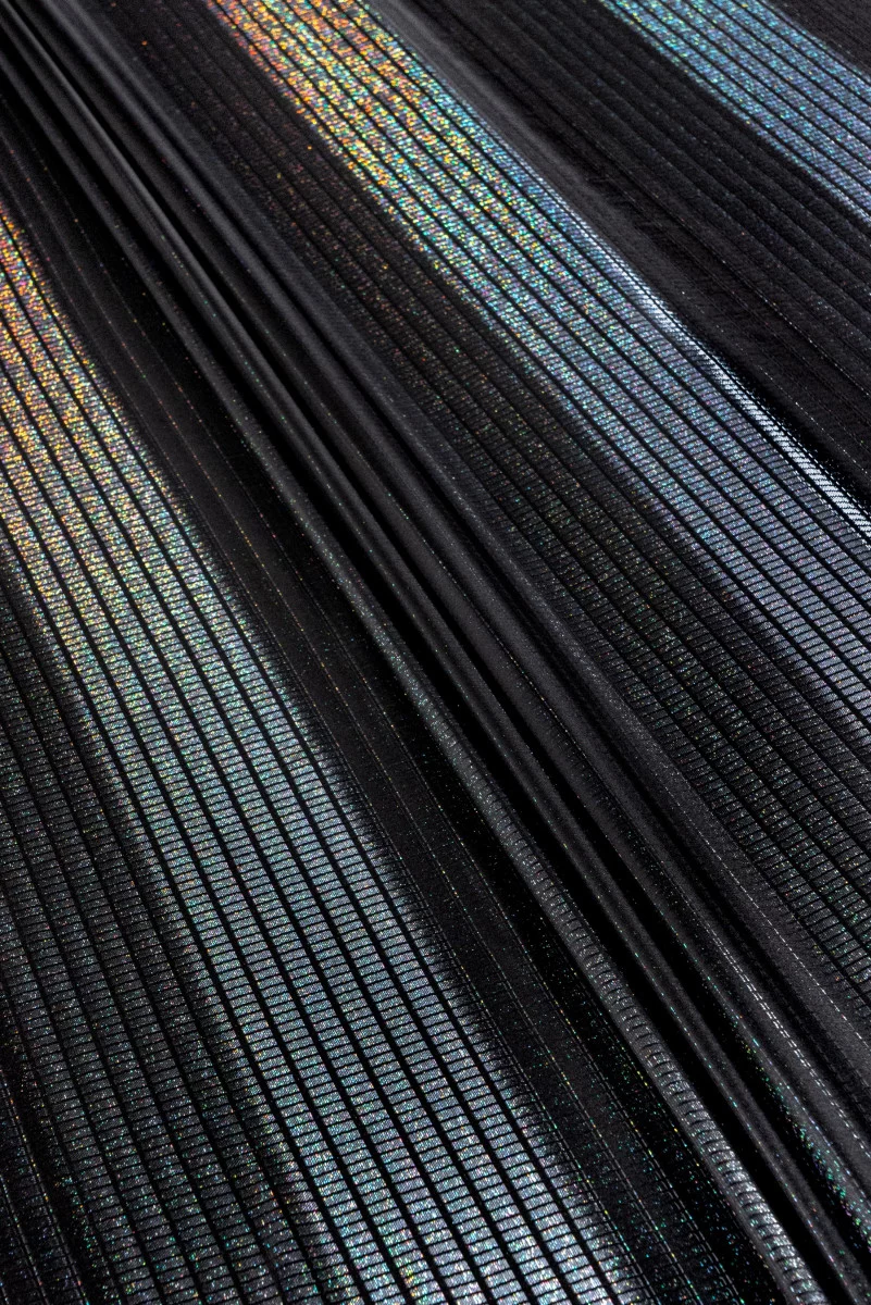 Itāļu žakarda kostīma audums melnā krāsā ar ēnainu čekas motīvu, kas rada vertikālas svītras. Audums ir plāns, bet necaurspīdīgs, mīksts, skaisti dekorēts ar lurex diegu daudzkrāsainā krāsā. Lieliski piemērots vakarkleitas, blūzes vai kostīma šūšanai.