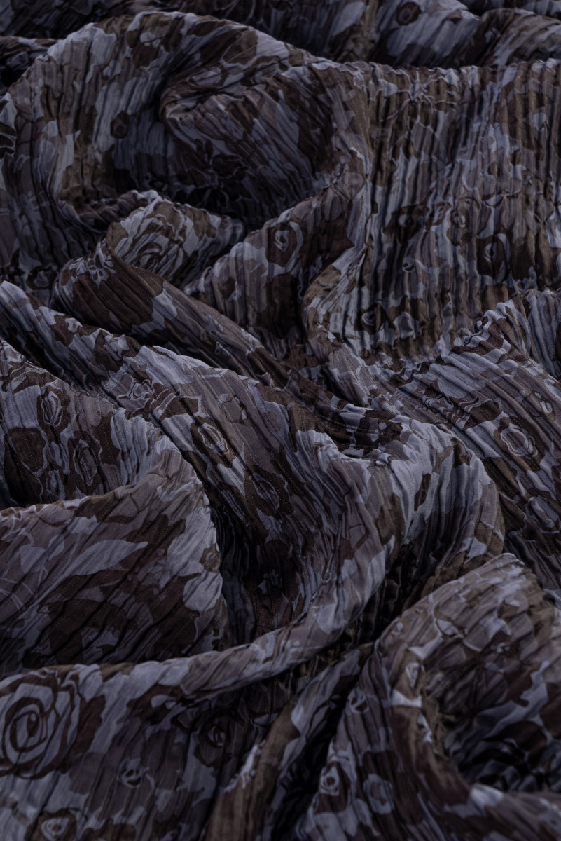 Itāļu žakarda kostīmu audums klusinātā purpursarkanā krāsā ar brūnu ziedu motīvu. Plāns, mīksts audums ar ļoti interesantu, gofrētu tekstūru.