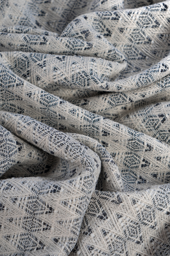 Itāļu žakarda kostīma audums pelēkā un écru krāsā ar nelielu dimantu motīvu, kas sakārtots horizontālās svītrās. Audums ir biezāks, stīvs, austs kā chanel audums.