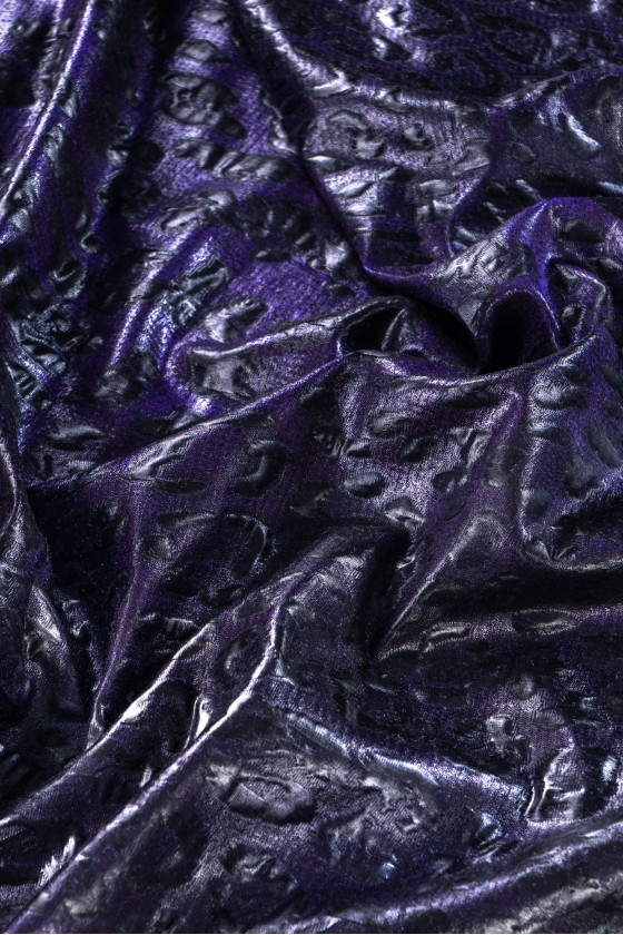 Itāļu žakarda kostīma audums purpursarkanā krāsā ar melnu, izliektu leoparda apdrukas motīvu (3D efekts). Audums ir biezāks, stīvs ar spīdīgu pārklājumu (impregnēšanas efekts).