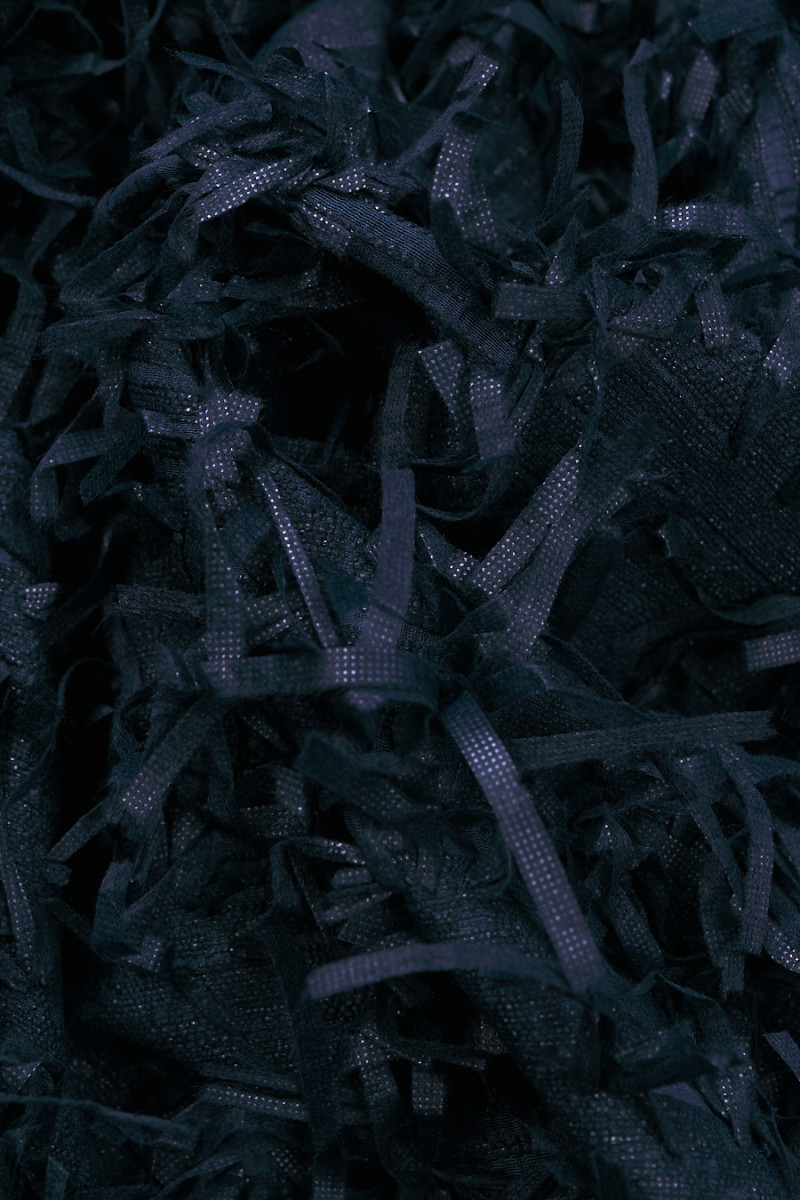 Itāļu žakarda kostīmu audums tumši zilā krāsā, neregulāri dekorēts ar 8 cm garām bārkstīm. Vidēji biezs audums, neelastīgs, nedaudz stīvs. Ideāli piemērots kostīma, kleitas, svārku, jakas šūšanai vai dekoratīviem nolūkiem.