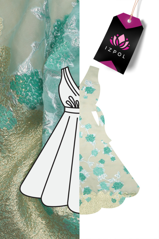 Itāļu organza audums kuponā ar izmēriem 190 cm* 140 cm, dekorēts ar lurex diegu. Tirkīza audums ar žakarda motīvu buz ziediem tirkīza krāsā ar sudraba zariem, raksts sabiezē kupona apakšā, kas ir pabeigts ar 25 cm platu zelta jostu.