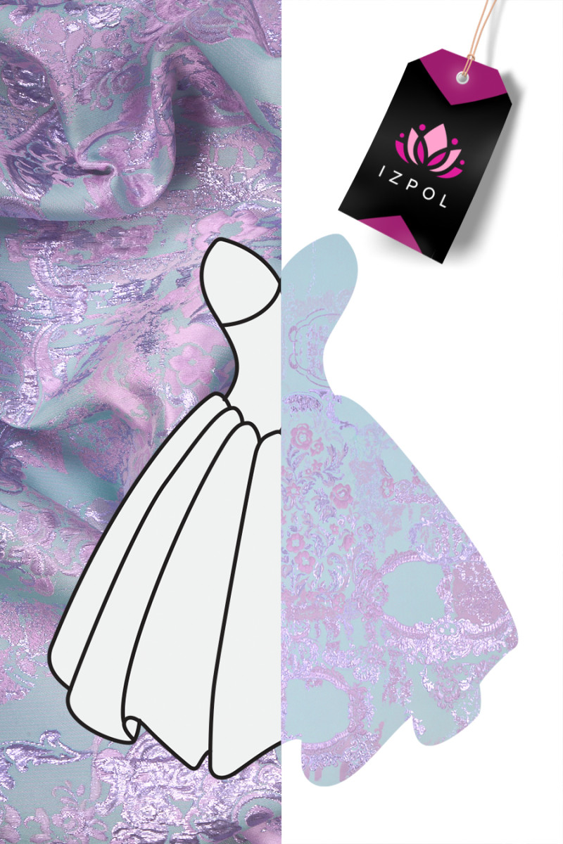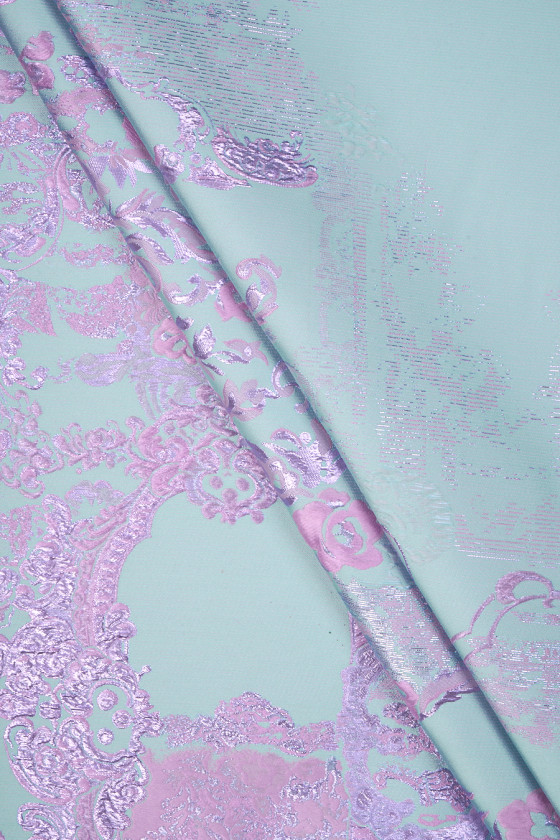 Itāļu žakarda kostīmu audums gaišā tirkīza krāsā ar rozā un purpura austrumu paneļu motīvu - modelis ir apkārtmērs. Vidēji biezs, necaurspīdīgs, neelastīgs, nedaudz stīvs audums - ideāli piemērots kleitas, svārku, kostīmu vai dekoratīviem nolūkiem.
