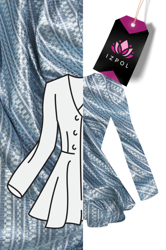 Itāļu žakarda kostīma audums zilā krāsā ar sudraba lurex diegu. Audumam ir smalks ģeometrisks motīvs, kas rada 2 cm platas horizontālas svītras. Vidēji biezs, necaurspīdīgs, neelastīgs, nedaudz stīvs audums - ideāli piemērots kleitas, svārku, kostīmu vai dekoratīviem nolūkiem.