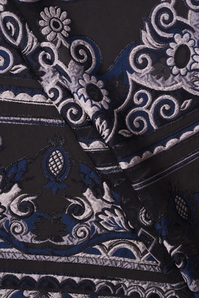 Itāļu organza audums kuponā ar izmēriem 180 cm* 140 cm. Audums ar acu struktūru melnā krāsā ar pelēku un tumši zilu rotājumu un ziedu motīvu.