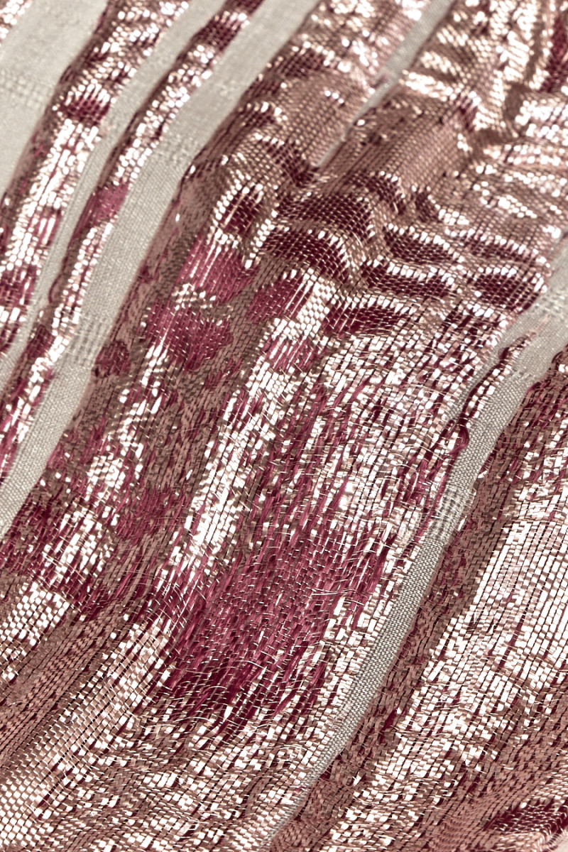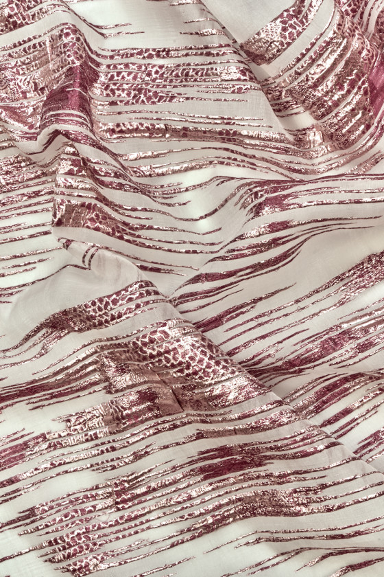 Itāļu organza audums krēmkrāsā ar žakarda apdari līniju veidā dažādos garumos un sadalījuma blīvumā. Žakarda raksts izgatavots no gaišas biešu krāsas ar daudz sudraba, spīdīgu pavedienu. Audums ir caurspīdīgs, neelastīgs, nedaudz stīvs. Lielisks piedāvājums, kas ir lieliski piemērots fenomenāliem vakara tērpiem.