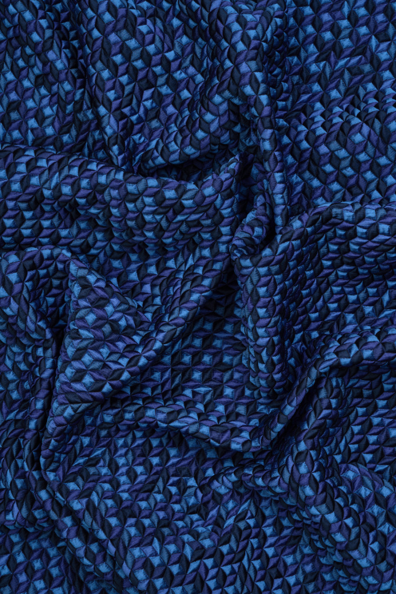 Itāļu žakarda audums ar nelielu, izliektu kuba motīvu zilā, tumši zilā un violetā krāsā. Regulārs raksts, kas sastāv no sīka romba ar izmēru 8mm*8mm, radot interesantu 3D efektu. Audums ir vidēja biezuma, mīksts, neelastīgs, ar atšķirīgu izliektu struktūru un nedaudz stīvu. Interesants piedāvājums svārkiem, jakām, kā arī plānam mētelim vai jakai.