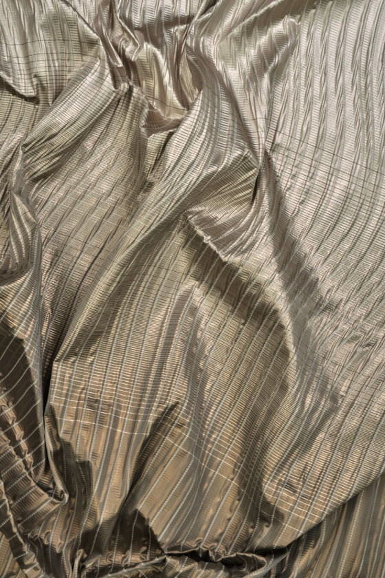 Itāļu žakarda audums pieejams 115cm*133cm platīna apzeltītos kuponos. Izšūšanas motīvs, veidojot izliektas līnijas uz vienas auduma malas tumšākā bēšā krāsā, kas auduma otrā malā pārvēršas viļņos gaišākā krāsā. Platums starp līnijām ir 1 cm. Audums ir diezgan plāns, bet necaurspīdīgs, tas der kā tafts - nedaudz stīvs un neelastīgs. Fantastisks piedāvājums mierīgā, bet elegantā krāsā kleitām, svārkiem, žaketēm.