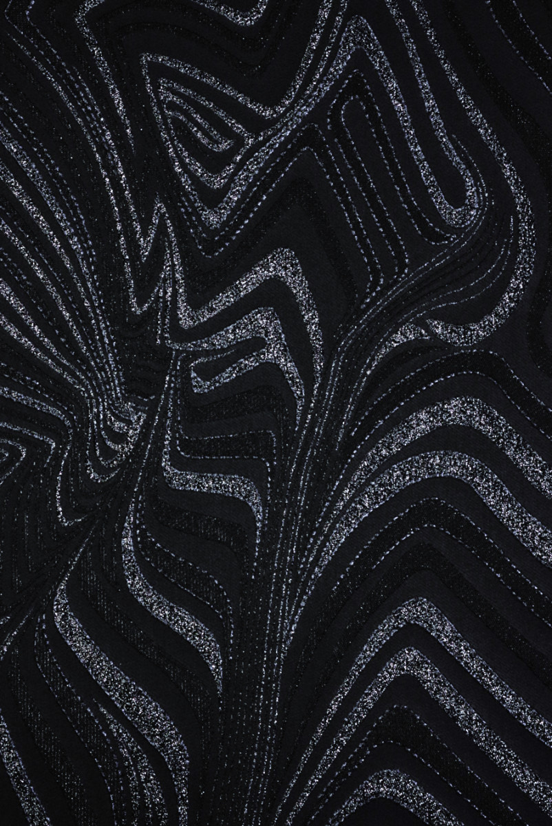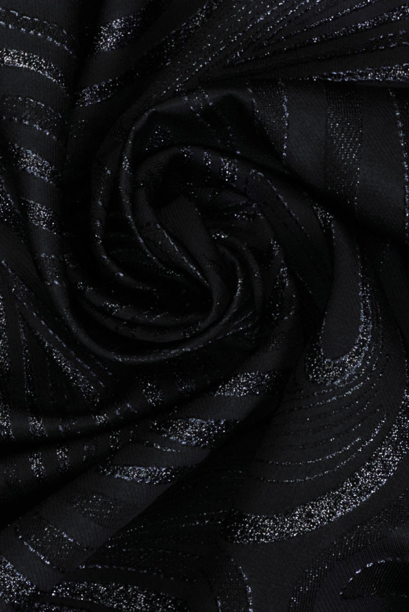Itāļu žakarda audums ar spīdīgu melnu viļņu motīvu uz melna fona. Audums ir plāns, bet pilnīgi necaurspīdīgs, diezgan mīksts, neelastīgs, viegls un ļoti efektīvs. Mēs iesakām izmantot oderi. Tas ir lieliski piemērots formāliem tērpiem, piemēram, kleitām un svārkiem. Tas labi darbosies arī ar jakām, jakām vai gaišiem mēteļiem. Ir pieejamas dažādas krāsu versijas.