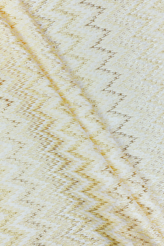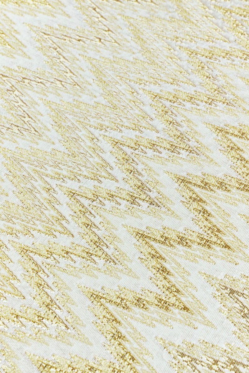 Itāļu žakarda audums ar smilškrāsas un zelta zigzaga motīvu. Regulārs, blīvs modelis, kas skaisti dekorēts ar zelta pavedienu. Audums ir vidēja biezuma, nedaudz stīvs, neelastīgs un necaurspīdīgs. Iespaidīgs un svaigs piedāvājums, no kura jūs varat izveidot kostīmus, svārkus, jakas vai pavasara mēteļus.