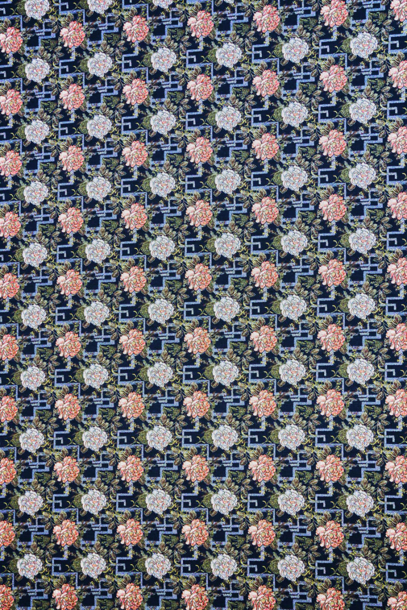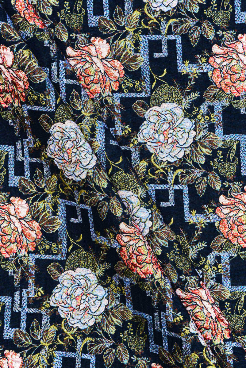 Itāļu žakarda audums ar pasteļziedu motīvu uz tumši zila fona. Regulārs un blīvs, ziedu raksts, kas savijas ar ģeometriskiem motīviem zilā krāsā, viss ir smalki dekorēts ar zelta pavedienu, pateicoties kuram materiāls iegūst eleganci. Audums ir vidēja biezuma, necaurspīdīgs, mīksts un neelastīgs. Tas ir lieliski piemērots kleitas, svārku, jakas un plānas mēteļa šūšanai.