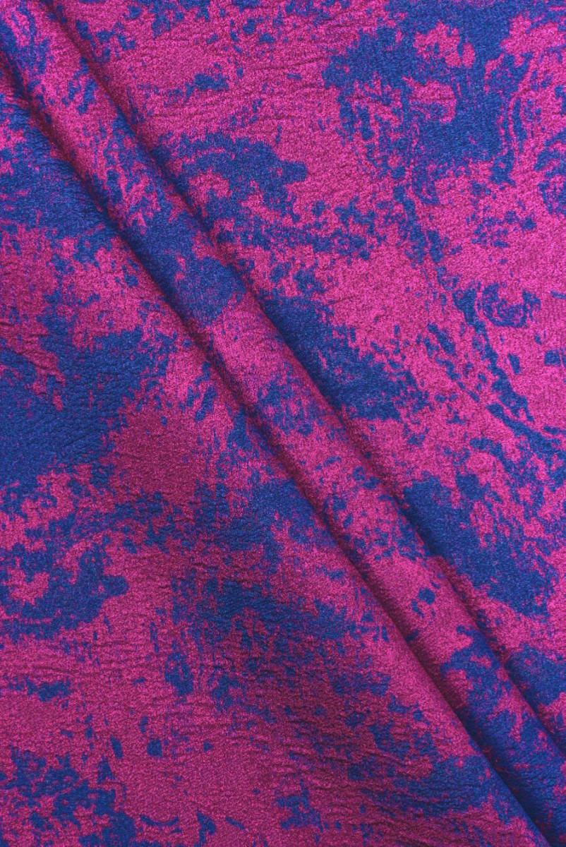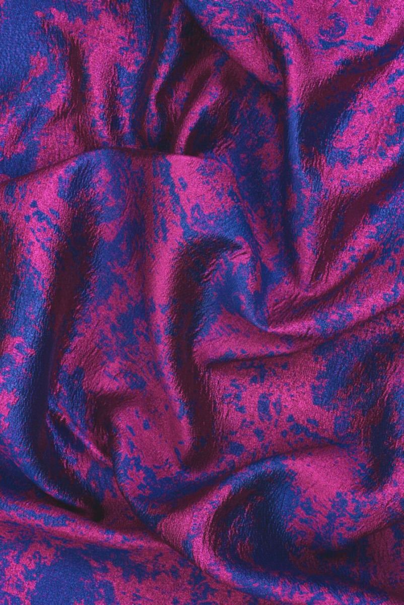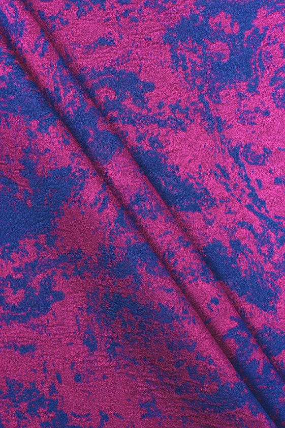 Žakarda audums, kas austs interesantā, abstraktā rakstā no divām pavedienu krāsām: fuksijas un purpura zilas. Neregulārie motīvi ir skaidri un diezgan lieli. Audums ir plāns, bet necaurspīdīgs, neelastīgs, nedaudz stingrs, tāpat kā tafta, tam ir skaists spīdums un maiga, izliekta struktūra. Unikāls materiāls, kas ideāli piemērots vakara tērpiem, piemēram, kleitām, svārkiem vai jakām. Tas labi darbosies arī kā dekoratīvs audums.