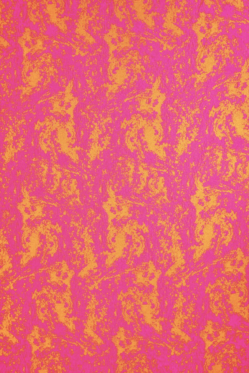 Žakarda audums, kas austs interesantā, abstraktā rakstā no divām diegu krāsām: rozā un oranža. Neregulārie motīvi ir skaidri un diezgan lieli. Audums ir plāns, bet necaurspīdīgs, neelastīgs, nedaudz stingrs, tāpat kā tafta, tam ir skaists spīdums un maiga, izliekta struktūra. Unikāls materiāls, kas ideāli piemērots vakara tērpiem, piemēram, kleitām, svārkiem vai jakām. Tas labi darbosies arī kā dekoratīvs audums.