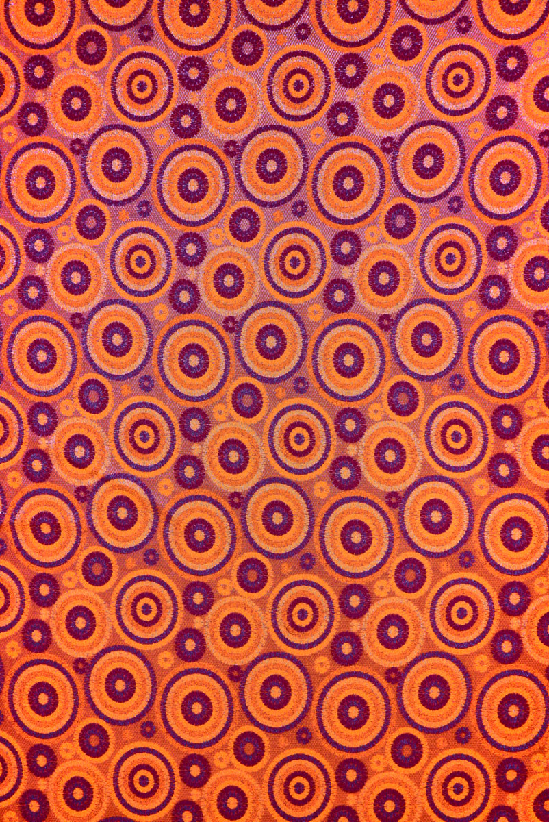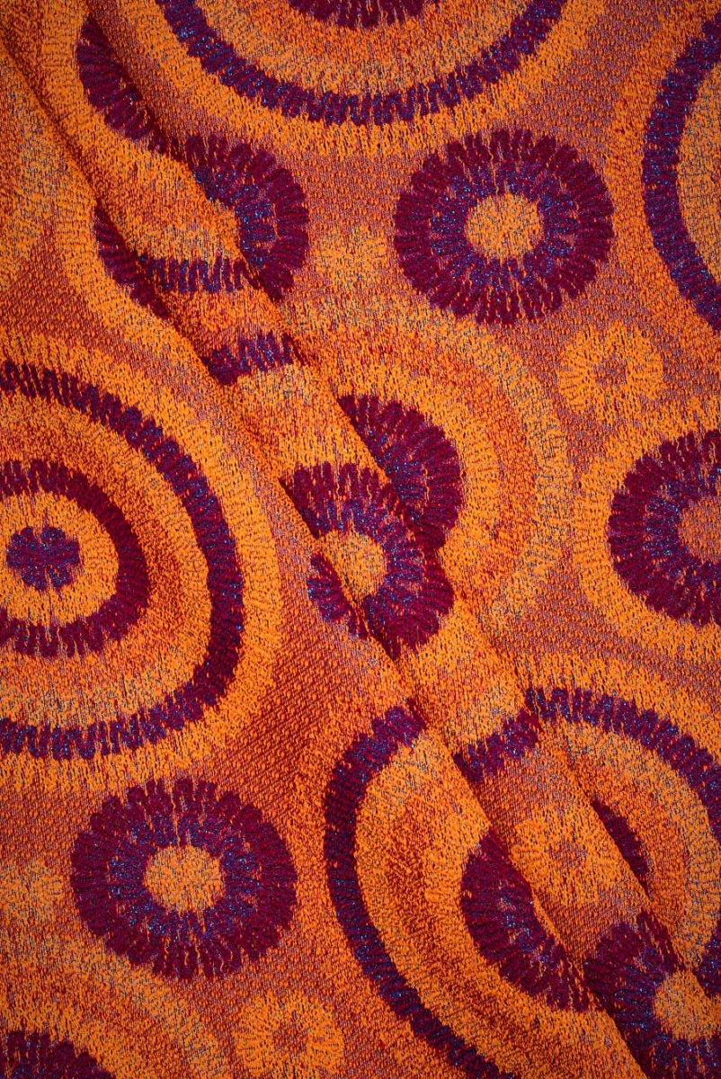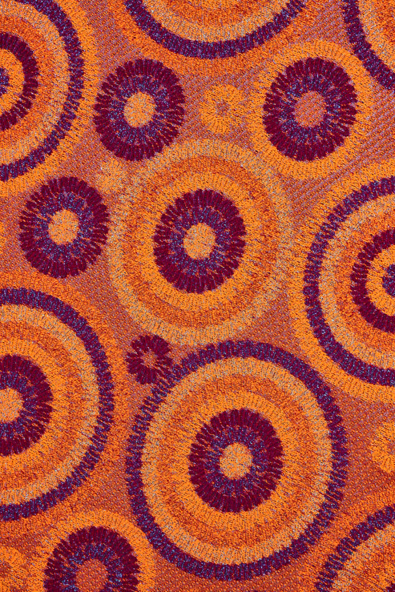Žakarda audums ar krāsainu rozešu motīvu dažādos izmēros uz sulīga oranža fona. Blīvs, regulārs raksts, kas izgatavots divos oranžā un tumši rozā toņos, un viss ir dekorēts ar spīdīgu rudzupuķu zilu pavedienu. Lielākā rozete ir 19 cm plata, mazākās ir 11 cm, 8 cm un 4 cm platas. Audums ir diezgan plāns, bet necaurspīdīgs, neelastīgs, viegls un nedaudz stingri pieguļ, un spīdīgais pavediens skaisti atspoguļo gaismu. Aušana ir nedaudz izliekta. Unikāls materiāls, kas ir ideāli piemērots kleitām, svārkiem, jakām vai viegliem mēteļiem.
