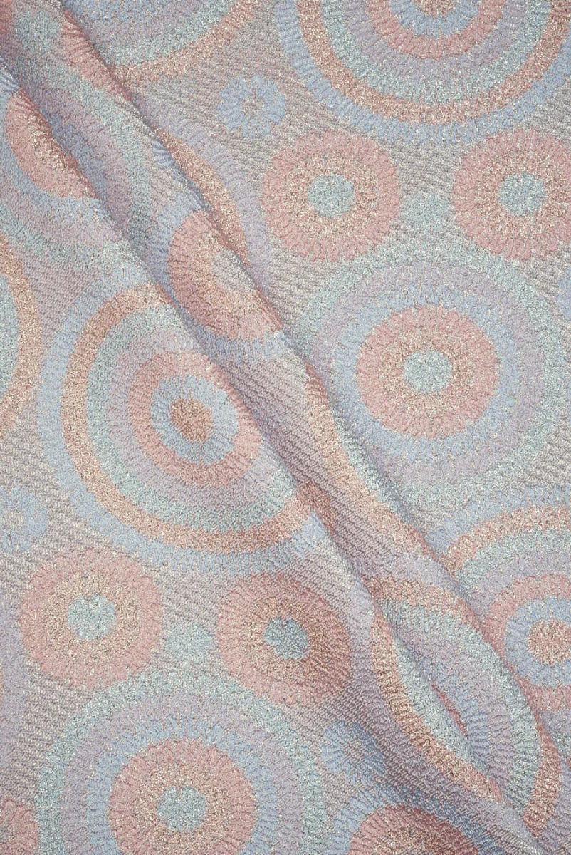 Žakarda audums ar pasteļrozešu motīvu dažādos izmēros uz gaiša fona. Blīvs, regulārs raksts, kas izgatavots no pavediena pasteļzilā, violetā un laša rozā, un viss ir dekorēts ar spīdīgu zelta pavedienu. Lielākā rozete ir 19 cm plata, mazākās ir 11 cm, 8 cm un 4 cm platas. Audums ir diezgan plāns, bet necaurspīdīgs, neelastīgs, viegls un nedaudz stingri pieguļ. Unikāls materiāls, kas ir ideāli piemērots kleitām, svārkiem, jakām vai viegliem mēteļiem.
