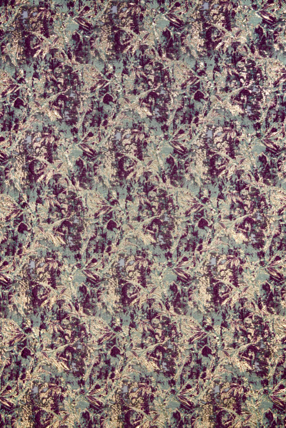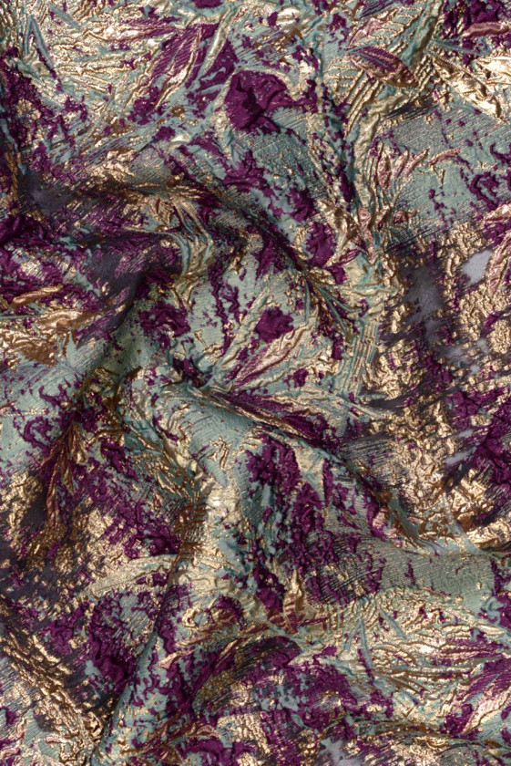 Žakarda audums, kas attēlo abstraktus, izliektus motīvus purpura un zelta krāsā uz gudra fona. Viss ir blīvi austs uz melna organzas auduma, ar pašu organzas fragmentu ik pēc 30 cm, kas ir caurspīdīgs un neregulārs, un tā izmērs ir aptuveni 14 cm platākajā vietā un apmēram 24 cm garākajā vietā. Audums ir plāns, neelastīgs, parasti necaurspīdīgs, nedaudz stingri pieguļ, un zelta pavediens piešķir skaistu spīdumu. Žilbinošs materiāls, kas lieliski izskatīsies vakara tērpos, piemēram, kleitām, svārkiem, jakām. To var izmantot arī kā dekoratīvu audumu.